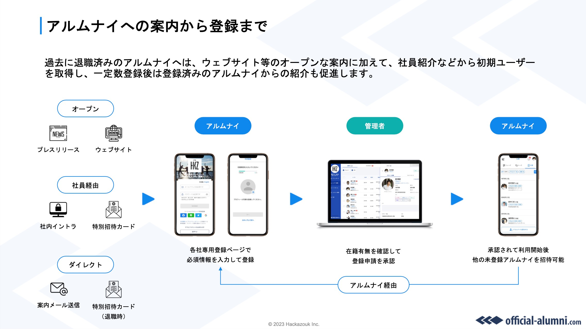 なお、本ネットワークのプラットフォームには、株式会社ハッカズーク(代表取締役 CEO:鈴⽊仁志)が提供するアルムナイ専⾨サービス『Official-Alumni.com』を利⽤します。
