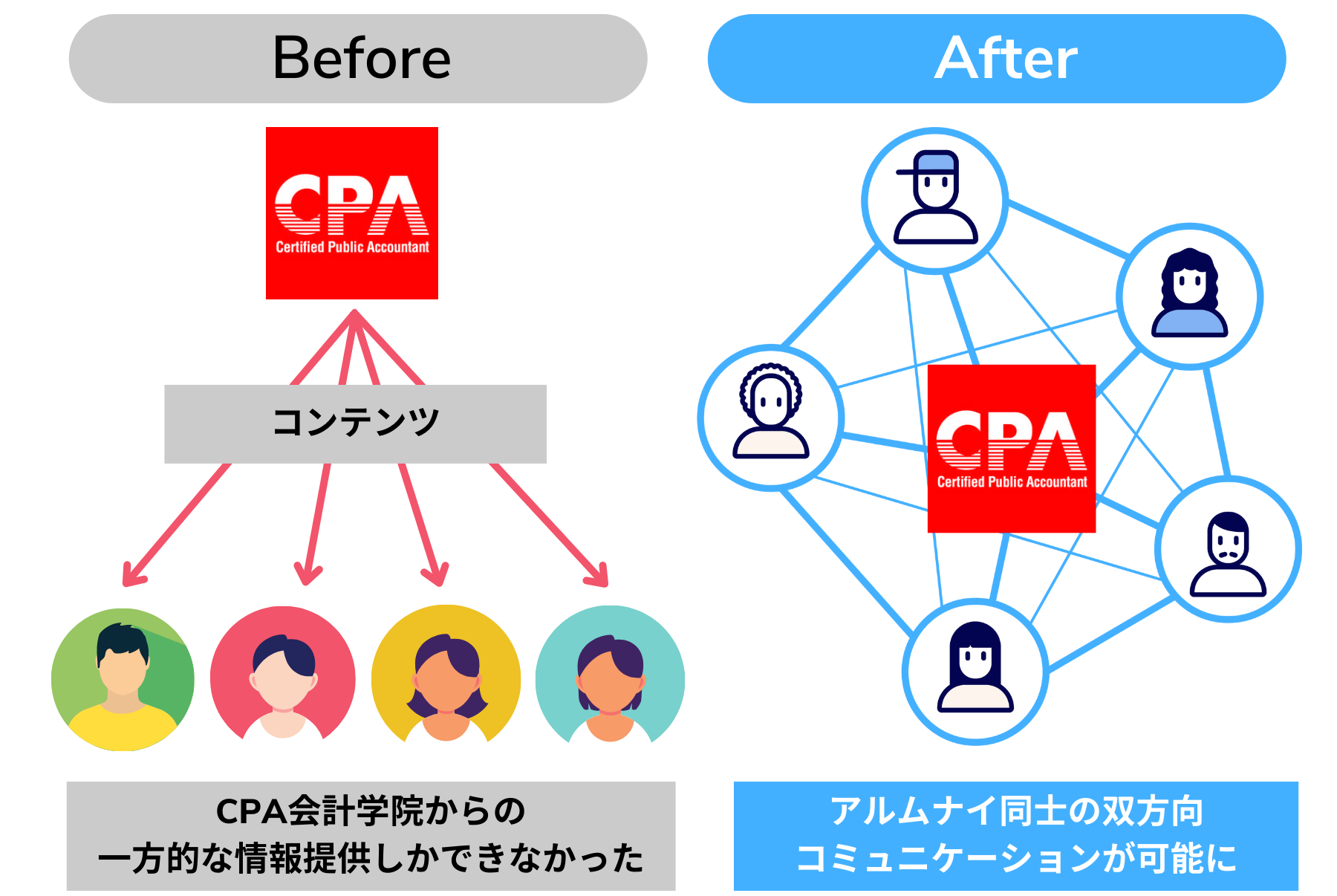 CPA会計学院卒業生のいまが分かり、卒業後も繋がり続けられる利用者同士の卒業生間の双方向コミュニケーションが可能に!
