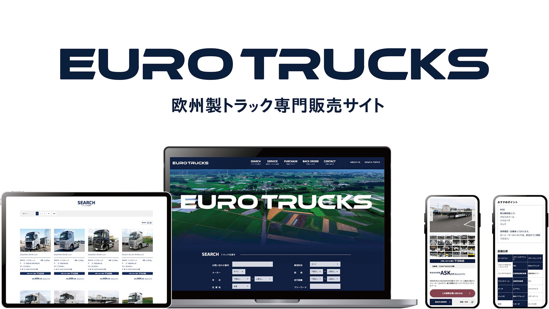 「EURO TRUCKS(https://euro-trucks.jp/)」は、欧州メーカーのトラック・トレーラーに特化した日本初の総合販売サイトです。当社が長年培ってきた中古トラックの仕入れの強みとマルチサービスのノウハウを活かし、国内で人気の高いスカニア、ボルボといった欧州を代表するメーカーの車両を中心に多数取り揃えております。