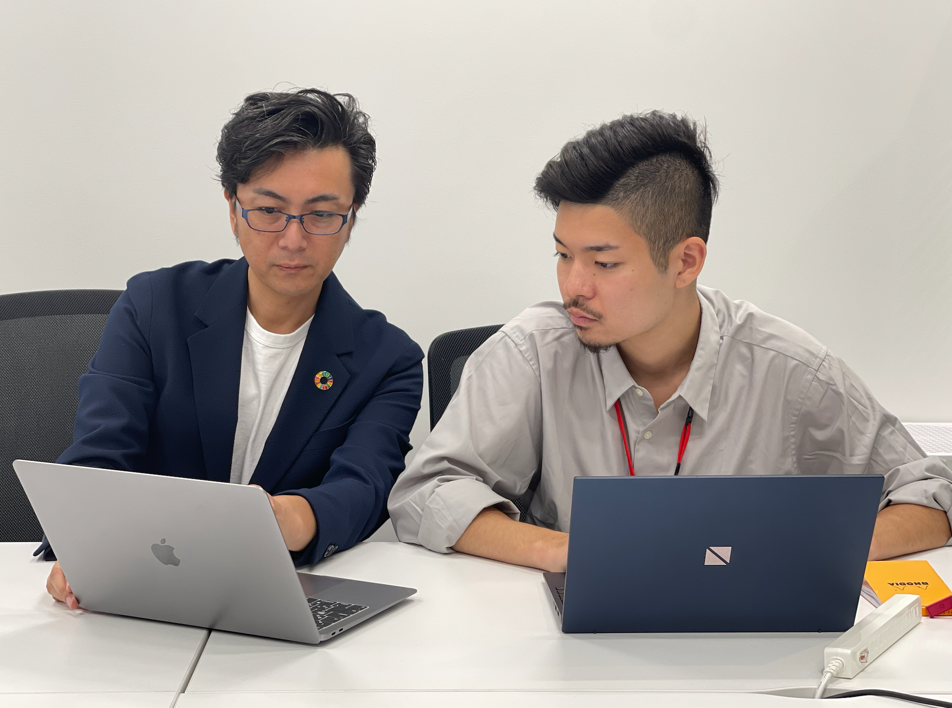 株式会社CAQNAL 代表取締役ナカシマアツシ(左)がiUインターン生と仕事を進める様子