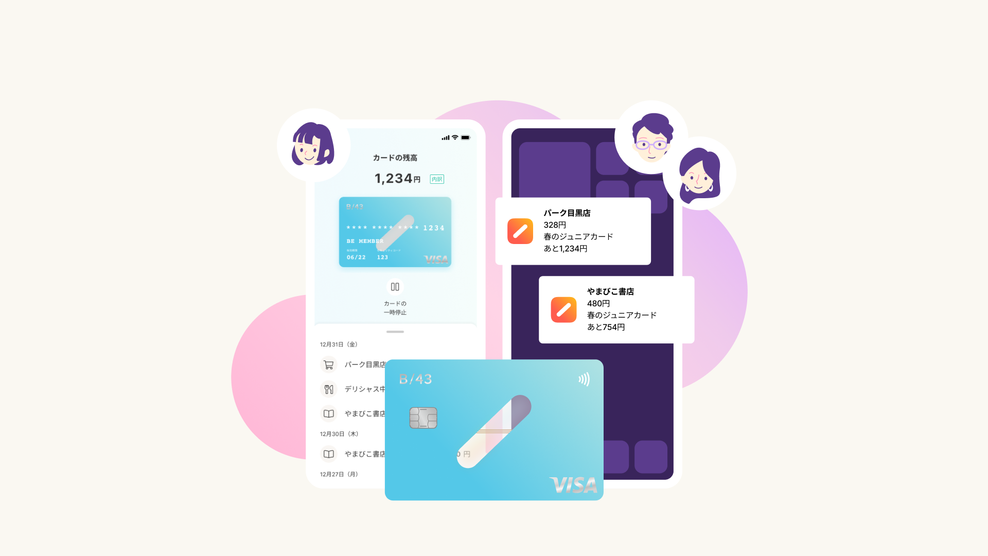今回リリースする「B/43ジュニアカード」は子どものうちから、キャッシュレス時代に適したお金の管理スキルの習得をサポートするサービスです。親がチャージした分しか使えないプリペイドカードであるため、使いすぎの心配がなく、クレジットカードを持たせる前の練習として最適です。親子それぞれのアプリから支払い履歴を確認でき、お金に関するスムーズなコミュニケーションを実現します。