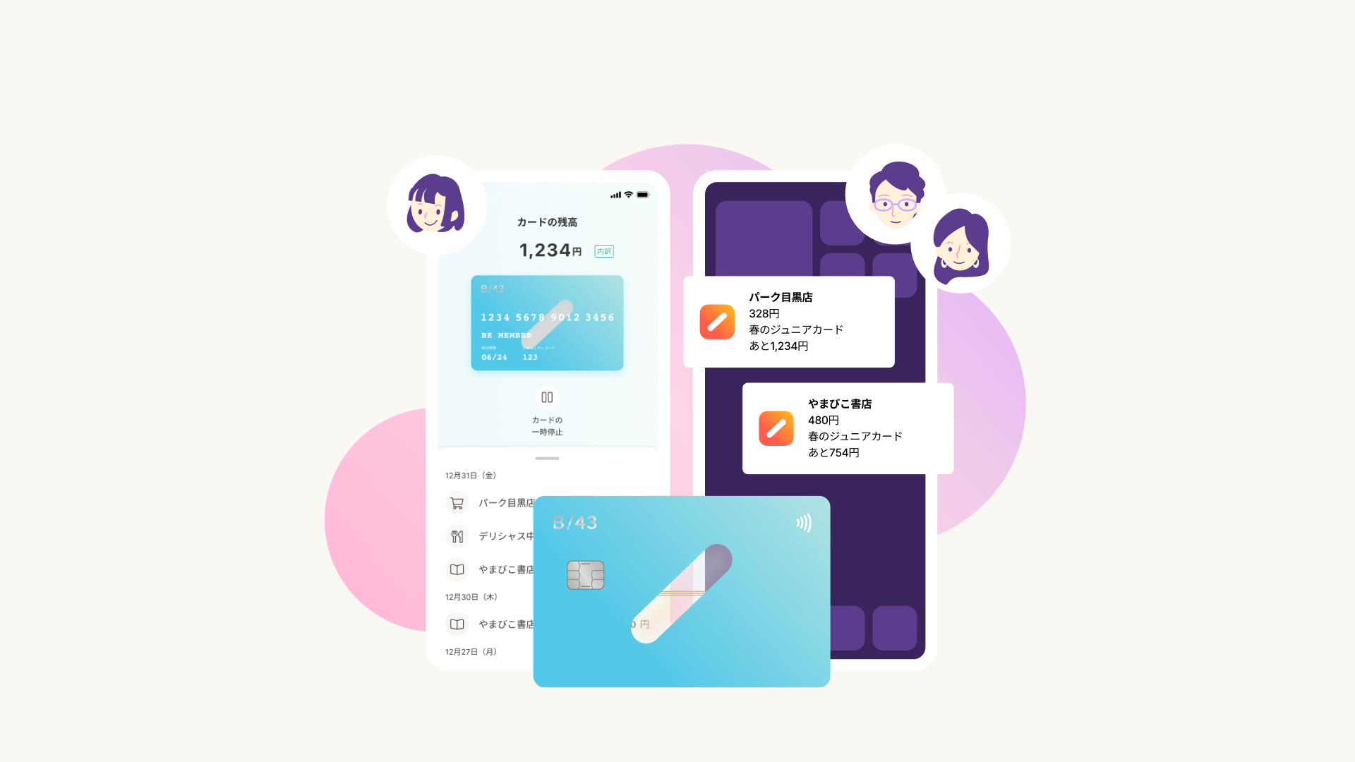 - 子ども専用のプリペイドカードを1枚発行。親子それぞれのスマートフォンのB/43アプリから、子どもの支払い履歴を確認でき、アプリを通して簡単に同じ情報が見られます