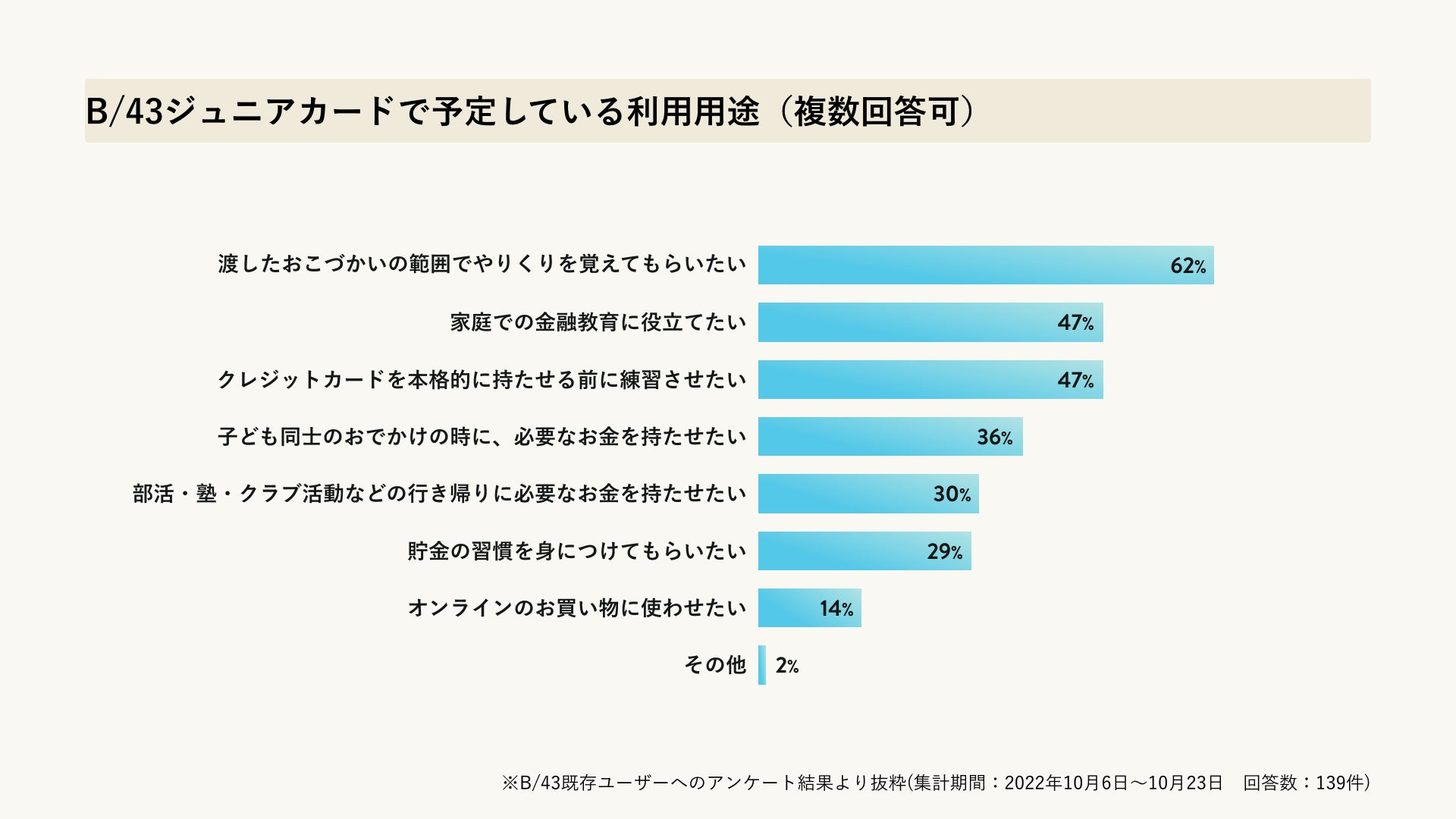 また、B/43ジュニアカード利用用途のアンケート(複数回答可)回答では、「渡したおこづかいの範囲でのやり繰りを覚えてもらいたい」が61.9%、「家庭での金融教育に役立てたい」が47.5%、「クレジットカードを本格的に持たせる前に練習させたい」が47.5%などの結果が出ました。
