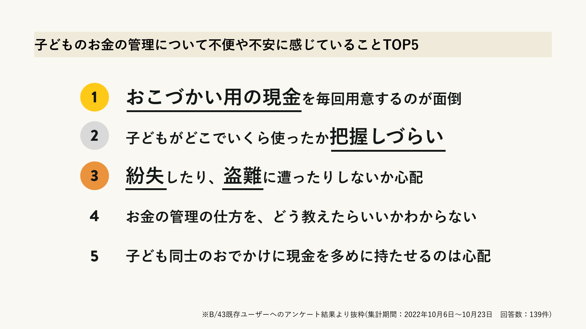 B/43ジュニアカードを通して、お金の管理ができるようになってほしいという親の想いが表れたアンケート結果となりました。
