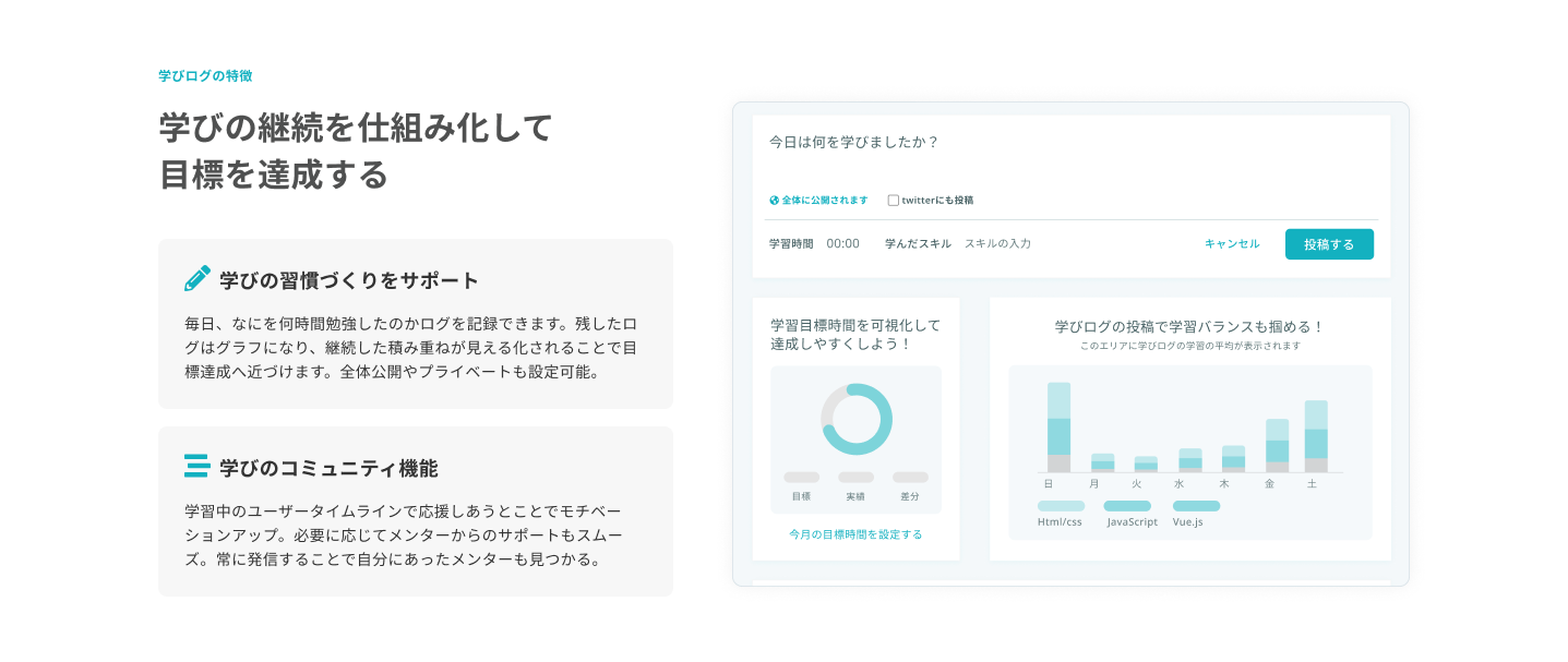 『MENTA』は、現役のエンジニアやデザイナーと学びたい人をマッチングすることができるため、デジタルスキルの習得を目標にしているユーザー様が多くいらっしゃいます。『学びログ』では、デジタルスキルを学習しているユーザー様の学習の習慣化を支援することができます。また、SNSでシェアすることも可能なため、同じように学習に励むユーザー様を見ることでモチベーションアップにもなります。