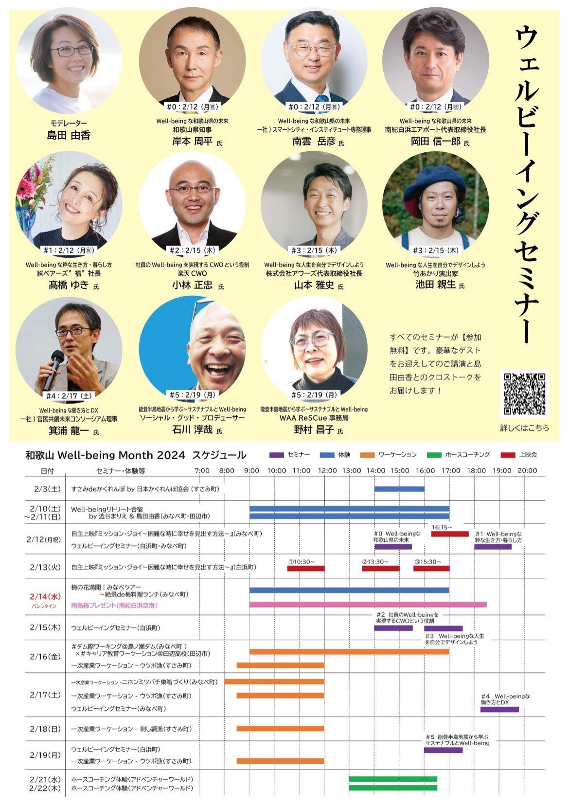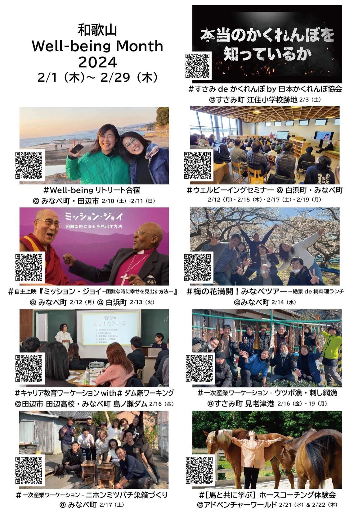 “ウェルビーイングセミナー”は、2月12日(⽉)和歌⼭県知事 岸本周平氏の特別基調パネルディスカッションを⽪切りに、新しい気づきと学びにあふれたセッションを繰り広げ、⽇本かくれんぼ協会と展開するかくれんぼ⼤会、⼀次産業ワーケーションを再びウツボ漁で、そして新しいスタイルのキャリア教育、Well-beingリトリート合宿、さらにはホースコーチングといった特別なアクティビティを体験できる1か⽉。