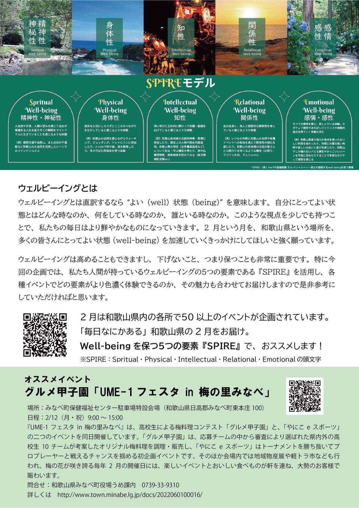ウェルビーイングとは直訳するとよい(well)状態(being)を意味します。自分にとってよい状態とはどんな時なのか、何をしている時なのか、誰といる時なのか。このような視点を少しでも持つことで私たちの毎日はより鮮やかなものになっていきます。本来2月という月は、和歌山県に51ある温泉や満開になる梅の花を楽しむ人で最も賑わう時だそう。2月という月を、和歌山県という場所を、和歌山県内外の多くの皆さんにとってよい状態(well-being)を加速するきっかけとなることを願っています。