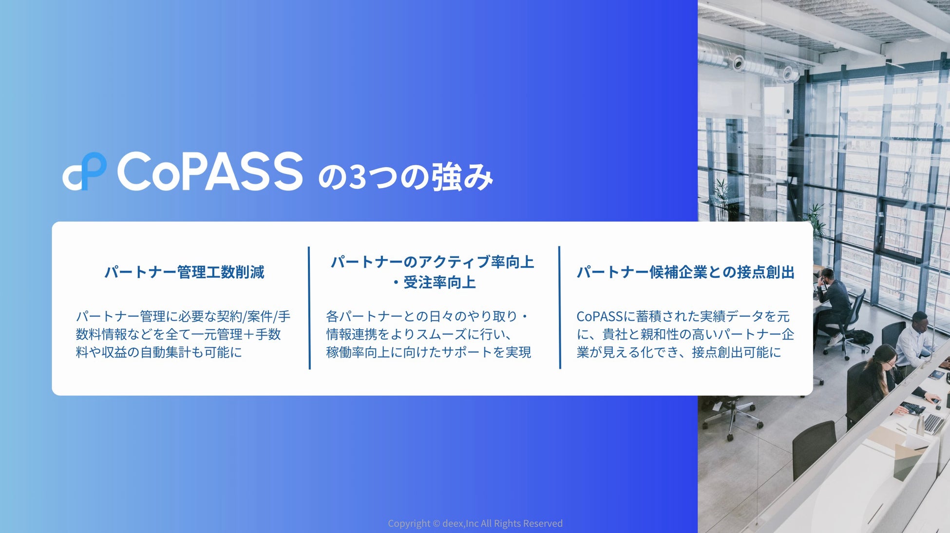 deex株式会社は、株式会社リクルート出身でパートナービジネスに精通したメンバーにて、代理店に関する幅広いビジネスを展開しております。 PRMという概念の基、モノやサービスを開発・販売しているメーカー(ベンダー)様が、それらを代理販売する営業代理店(パートナー)様との連携を強化・高度化するプラットフォーム「CoPASS(コーパス)」の提供や営業代理店を活用した事業成長(代理店戦略)のコンサルティング事業等を行っている会社です。