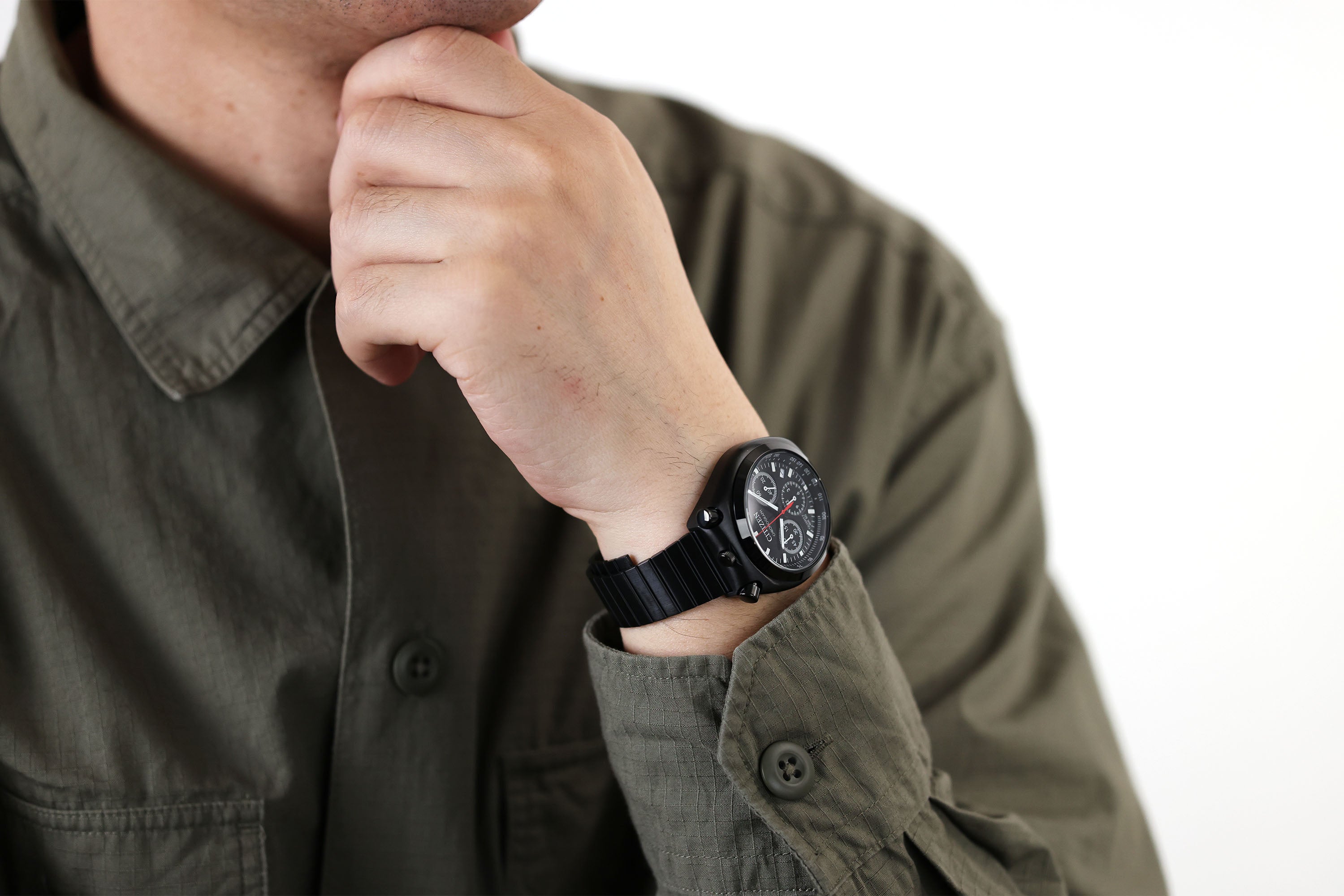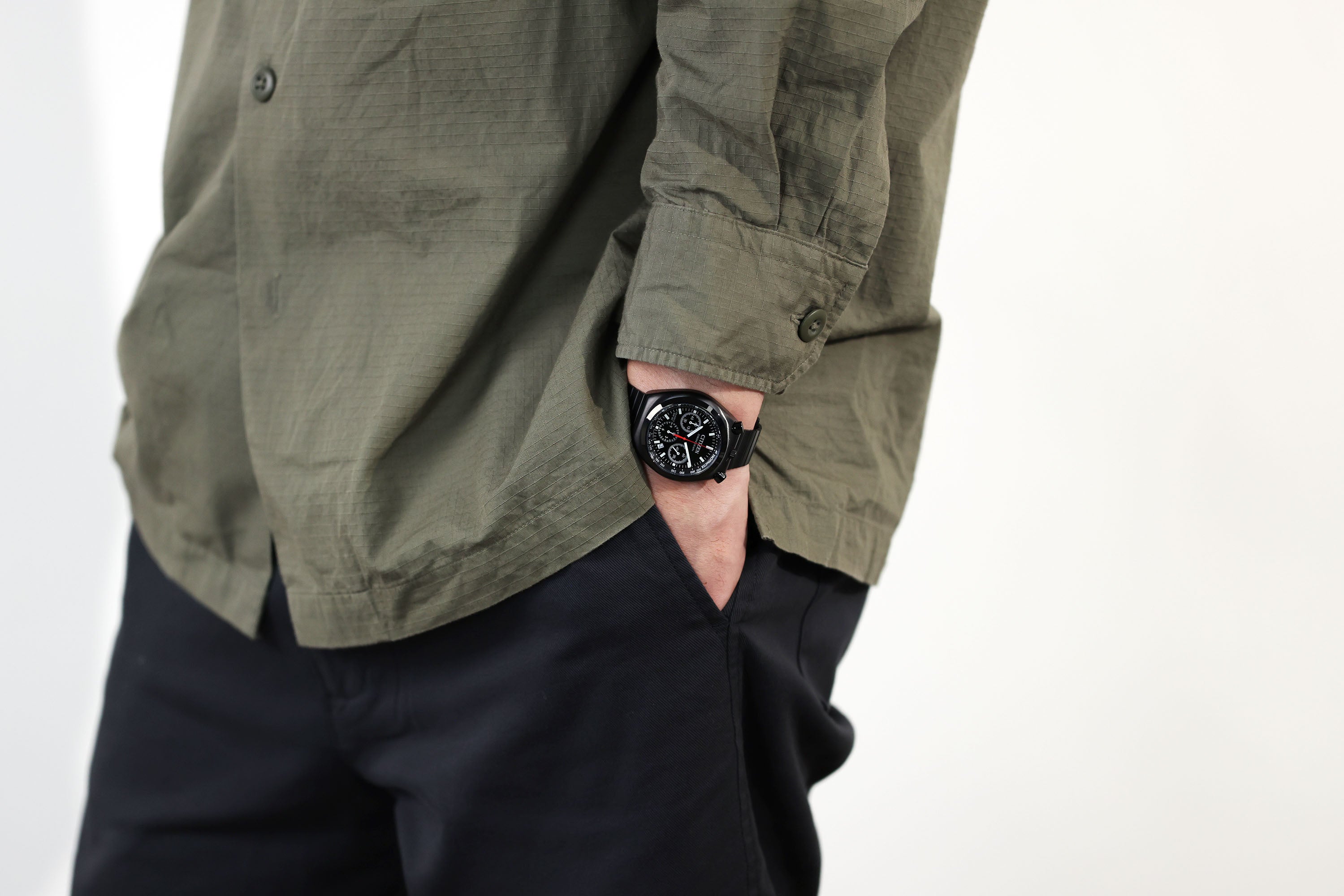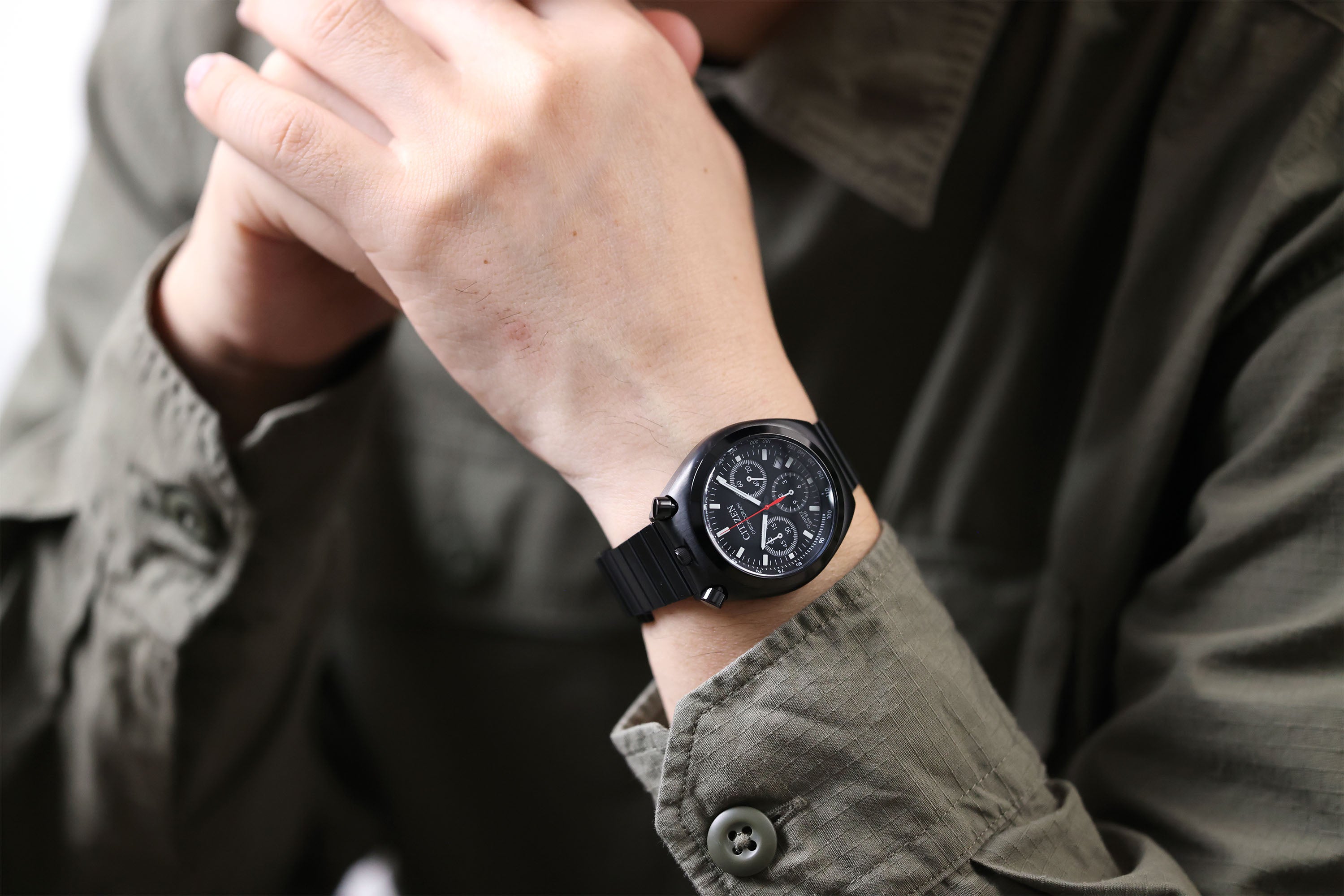 1972年に世界初のオールブラック時計が誕生。当初は斬新なカラーでしたが、現在では人気の高いカラーとして定着しています。そんなオールブラックを採用し、武骨かつ精悍で男心をくすぐるデザインに仕上げました。ミリタリーテイストのファッションに取り入れてほしい一本です。