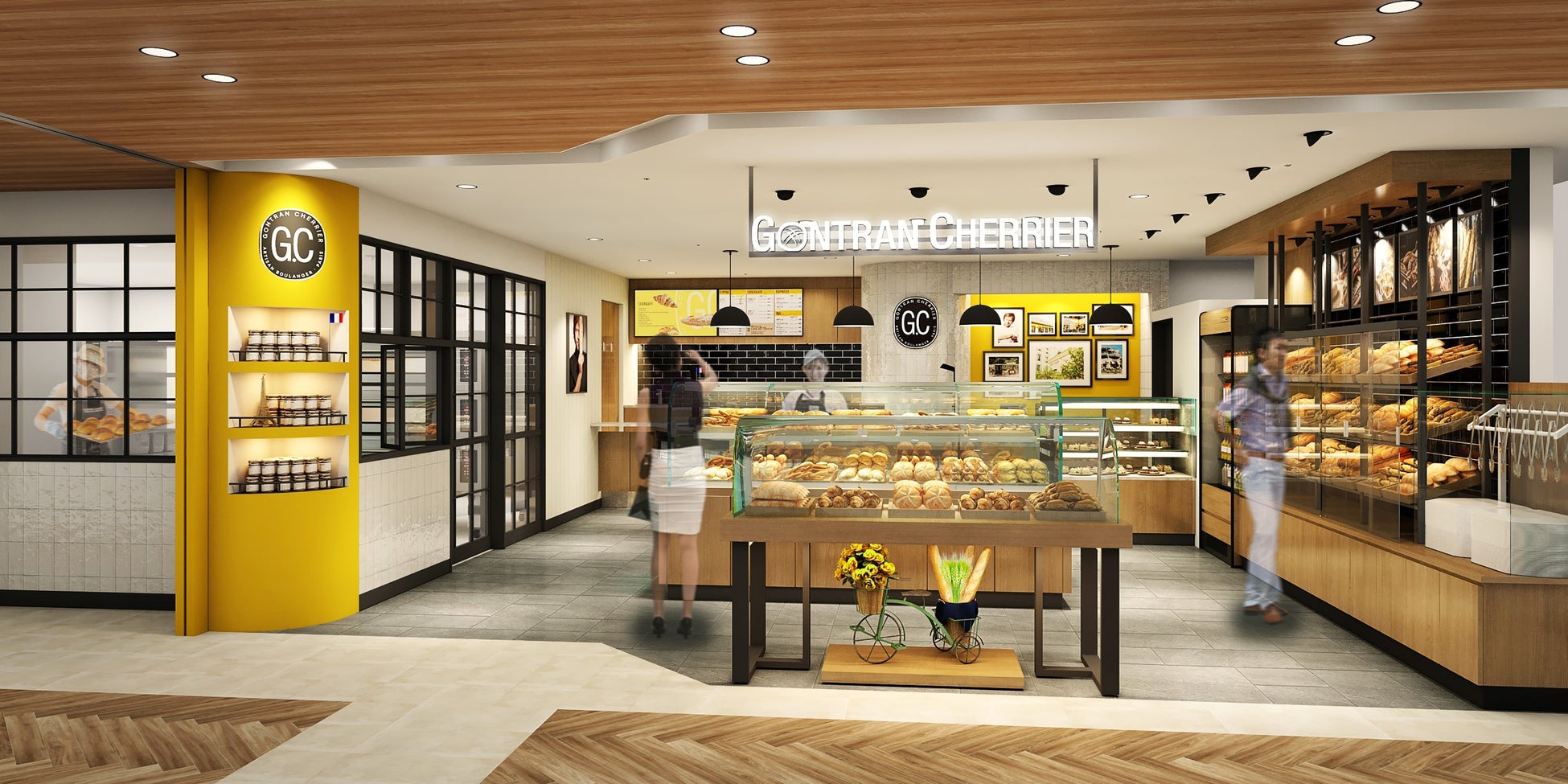 初のインショップ形態となる今回の店舗デザインは、イメージカラーであるイエローを基調に「パン職人ゴントランのライブキッチン(Cuisine dynamique de Gontran.)」をコンセプトとし、本場ブーランジェリーの雰囲気を体感いただけるよう、オープンで躍動感あるキッチンでパン職人が豪快にパンを焼き上げる姿をガラス越しに目にできる構成としました。焼きたてのパンの香りとライブ感あふれる店内で、代表商品であるクロワッサンをはじめとする上質なパンの数々をご提供します。なお、この開業に合わせ下記のオープンキャンペーンを実施します。