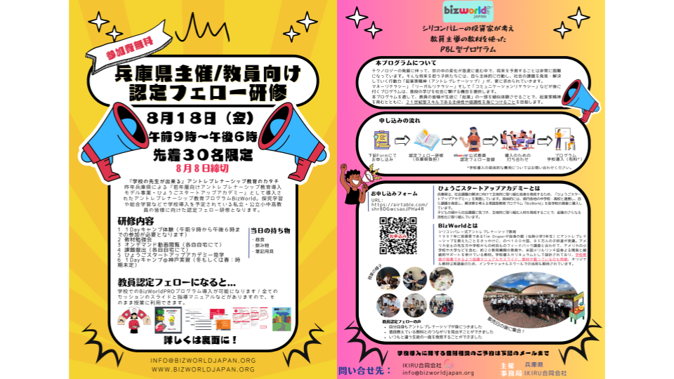また、教員第3期生認定フェローの募集(教員免許保持者)を予定しており、2023年8月18日、起業プラザひょうご(神戸市)にて実施をします。