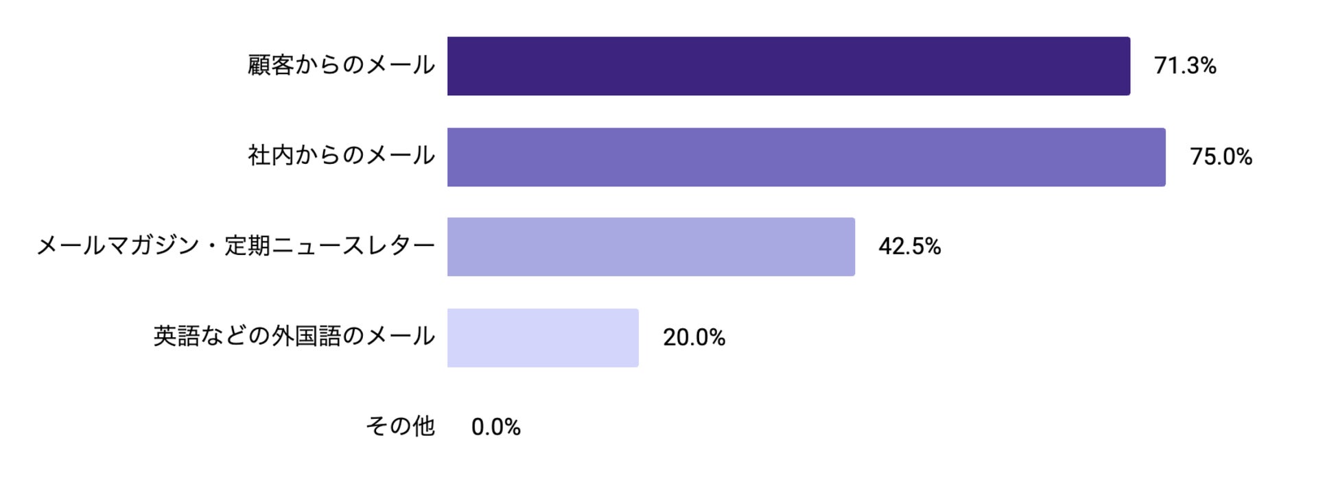 また、メールマガジンや定期ニュースレター(42.5%)、英語などの外国語メール(20.0%)でも活用されており、日々の情報整理のツールとしても活用されている様子が見られます。