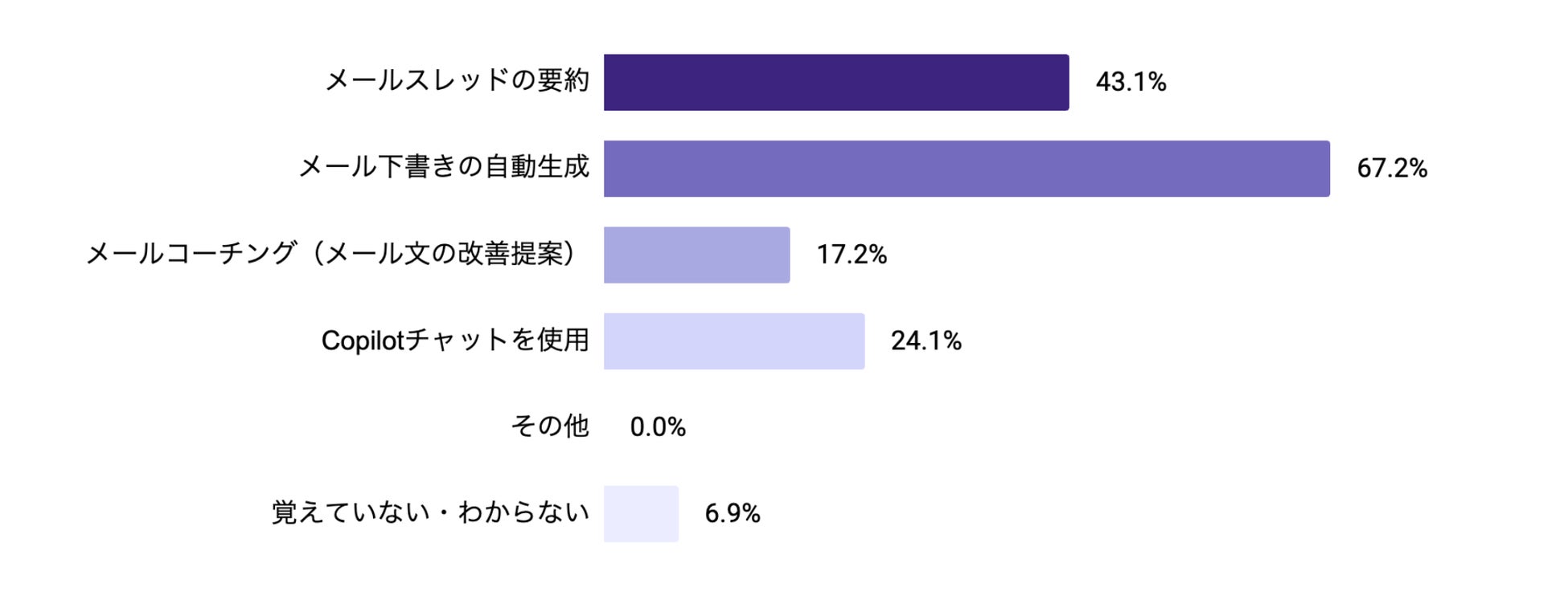 Outlookでは「メール下書きの自動生成」が最も活用されており、次いで「メールスレッドの要約」が2位となりました。