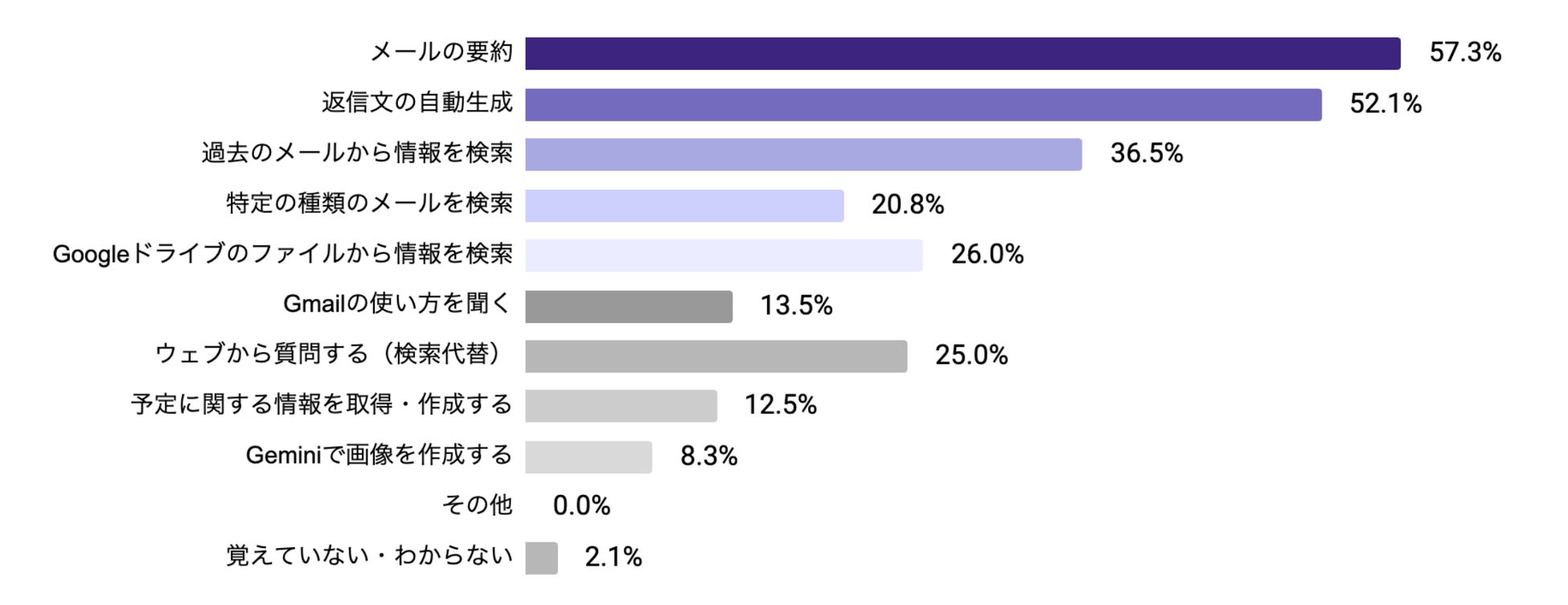 「メールの要約」が最も多く57.3%、「返信文の自動生成」が52.1%と、この2つの機能の利用が多いことが分かりました。