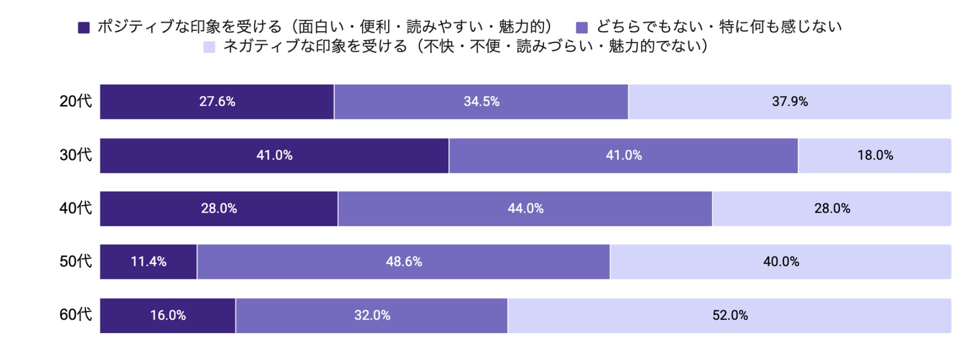 一方、60代では「ネガティブな印象を受ける」と回答した人が多く、世代によって感じ方に違いがあることが分かります。