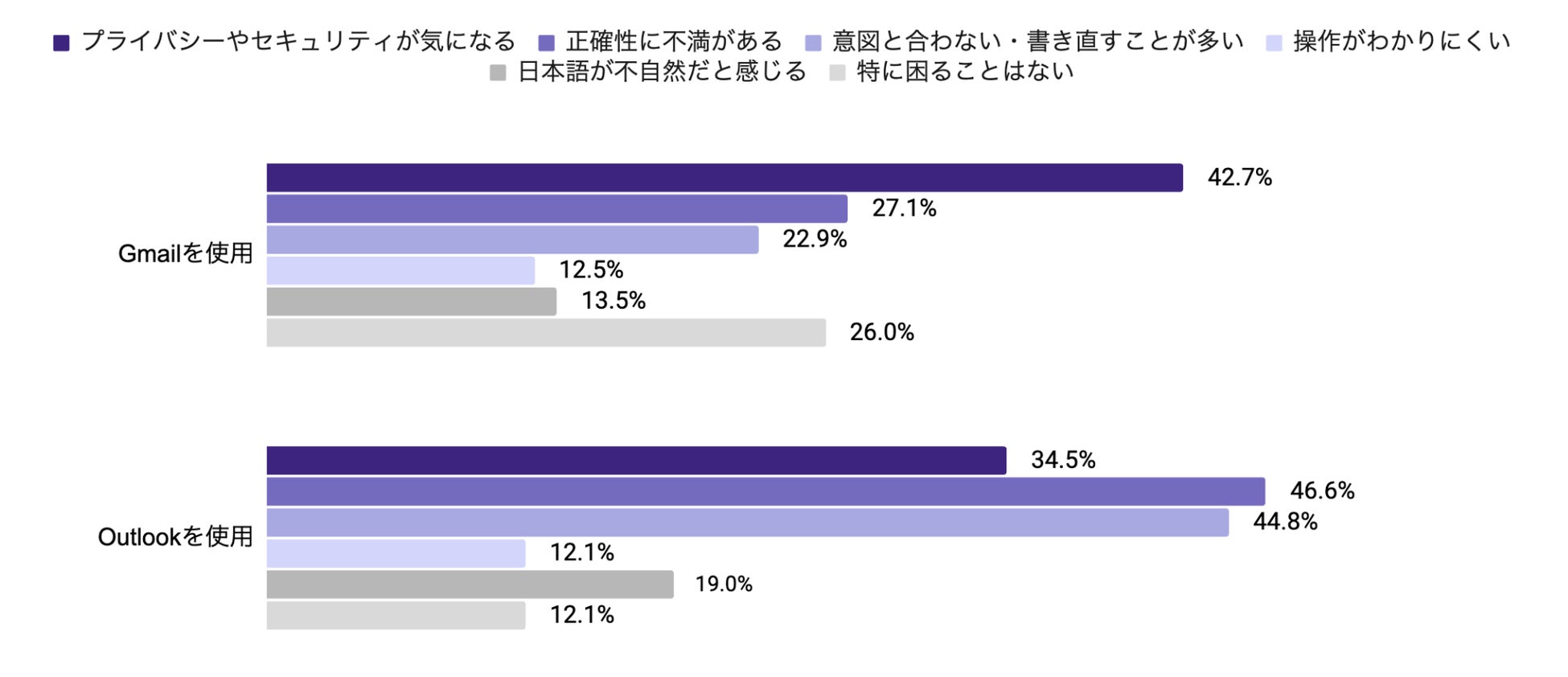 また、GmailとOutlookを比較したところ、Gmailは「プライバシーやセキュリティが気になる」、Outlookでは「正確性に不満がある」が最も多い結果となりました。さらに、Outlookでは「意図と合わない・書き直すことが多い」の回答がGmailより22ポイント程度高くなりました。