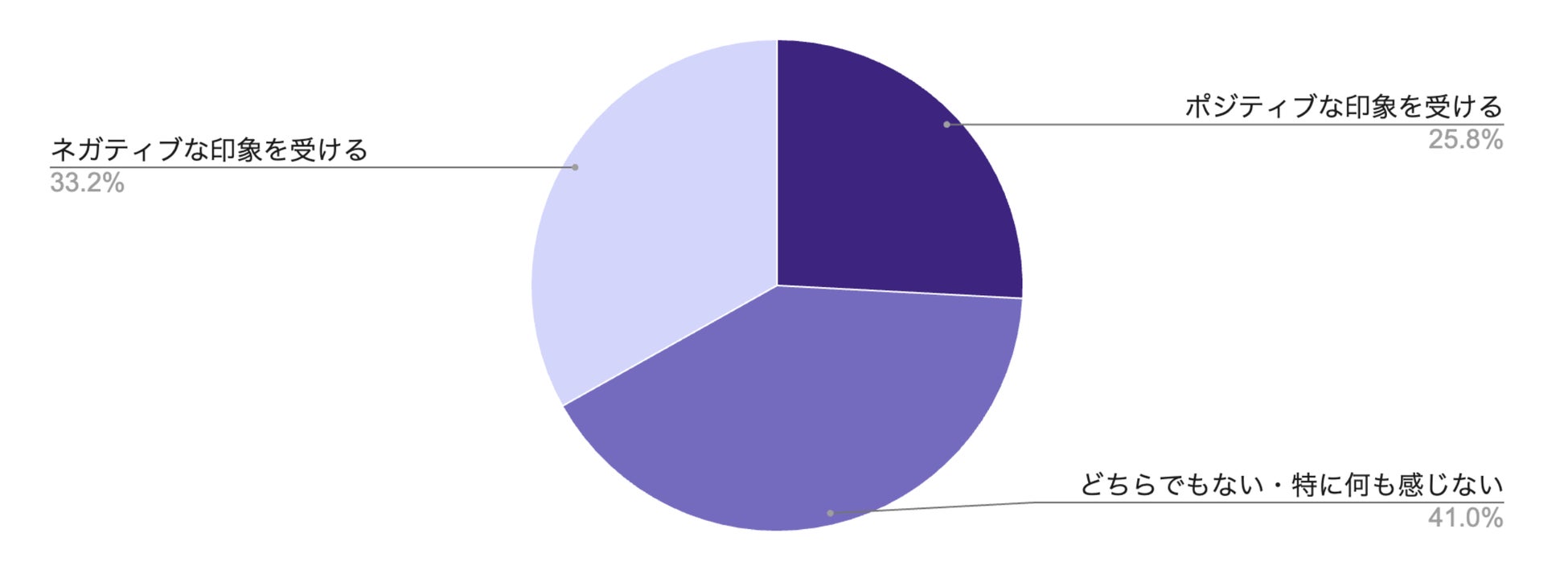 また、「ネガティブな印象」が33.2%、「ポジティブな印象」が25.8% となり、全体として受け止め方はまだ分かれている段階と言えそうです。