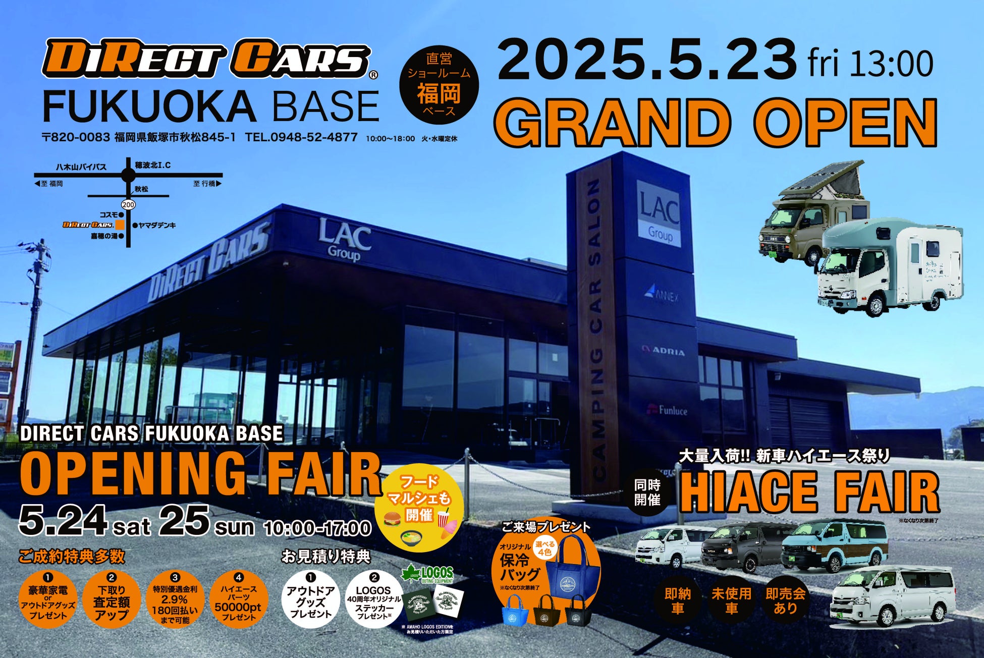 キャンピングカーメーカー「ダイレクトカーズ」(本社:三重県鈴鹿市、代表取締役:百田雅人)は、2025年5月23日(金)に、九州エリアで初となるショールームをグランドオープンいたします。これまで鈴鹿や厚木で展開してきた大型ショールームのノウハウを活かし、2700平方メートルの敷地と900平方メートルの建物を活用した、体験型のショールームとして九州に初進出。多彩なキャンピングカーの展示はもちろん、初めての方でも気軽に立ち寄れる店舗として、キャンピングカーのある暮らしをより身近に感じていただける場所を目指します。
