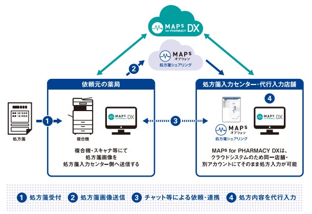 本製品では、クラウドによるロケーションフリーで入力可能な「MAPs for PHARMACY DX」と組み合わせることで、本部主導による処方箋入力センター運用や混雑時間帯が異なることを利用した他店舗からの代行入力、そして在宅勤務スタッフによる代行入力を円滑に行うが可能となります。