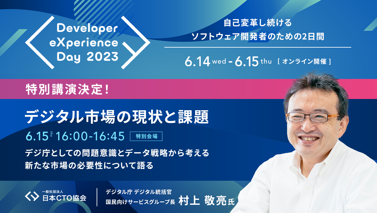 一般社団法人 日本CTO協会(本社:東京都渋谷区/代表理事:松岡剛志、以下:日本CTO協会)は、2023年6月14日(水)・15日(木)に開催する、開発者体験で世界をエンパワメントする「Developer eXperience Day 2023」大型オンラインカンファレンスを開催します。本カンファレンスの特別講演に「デジタル庁 デジタル統括官 国民向けサービスグループ長 村上 敬亮氏」の登壇が決定いたしました。