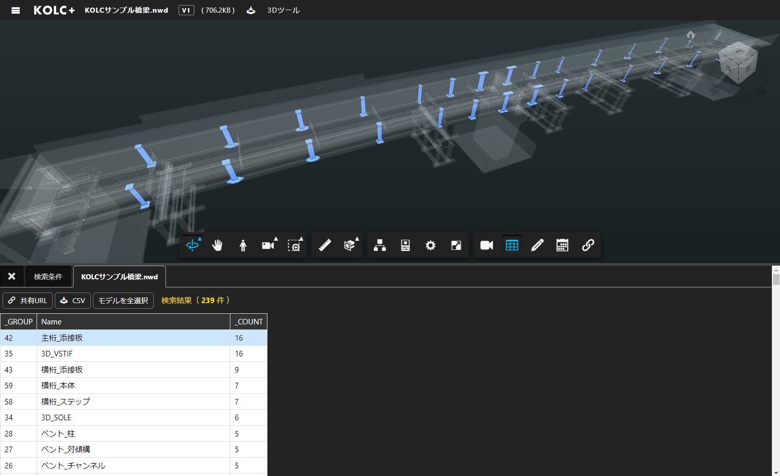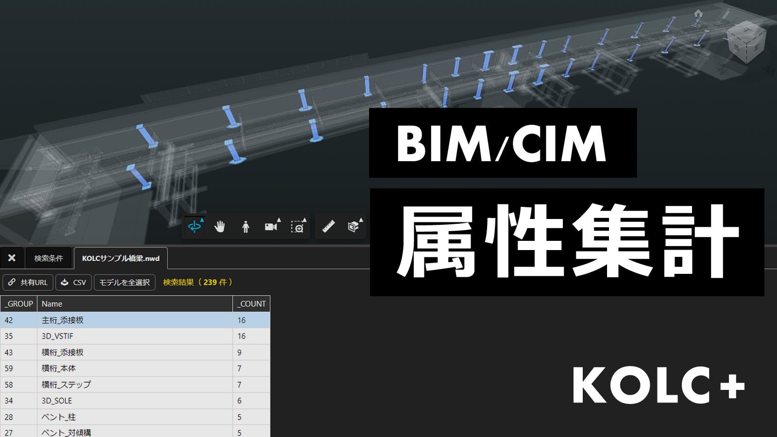 昨年3月に、KOLC+では「BIM属性検索ツール」をリリースしましたが、この時点では集計に対応しておらず、検索条件に一致した部材一覧を出力するまでに留まっていました。集計したい場合はCSV形式でダウンロードし、Excelで集計すれば数量を算出できますが、BIM/CIMモデルとの連携が切れてしまうため、算出した数量がどこの部材を拾っているのかを確認するのは困難な状況でした。