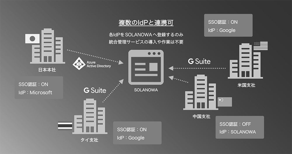 株式会社スカイアーク(本社:東京都千代田区丸の内、代表取締役:平栗健太郎)が提供するWeb社内報サービス「SOLANOWA(https://solanowa.jp/)」は、グループ会社横断のWeb社内報を運営する上で必要な、各社のシングルサインオン(SSO)基盤の統合管理システムの導入や統合作業の手間を省き、既存のIDプロバイダー(IdP)情報を登録するだけで一つのSOLANOWAへログインできる「複数IdP連携機能(Multiple IdPs for SAML2.0)」の提供を開始しました。