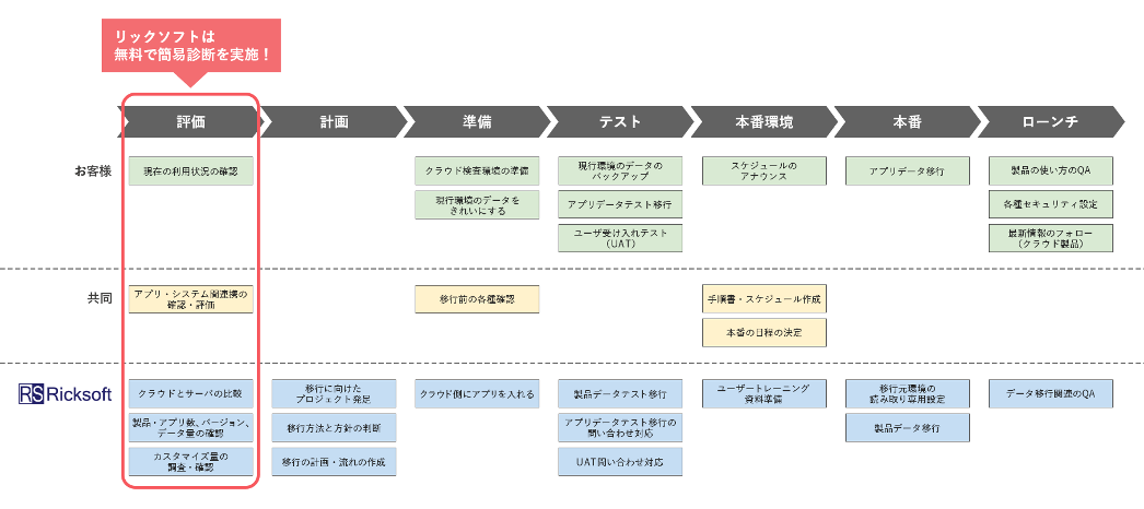 このステップの中でも方針を決定する「評価」は手間と時間がかかります。本移行診断では、この「評価」を簡易診断として無料で実施しています。簡易診断の結果を「移行診断書」としてお渡しし、無料相談会を経て、お客様自身で移行を実施するか、もしくはリックソフトのサポート付きでの移行実施にするかをご判断いただけます。