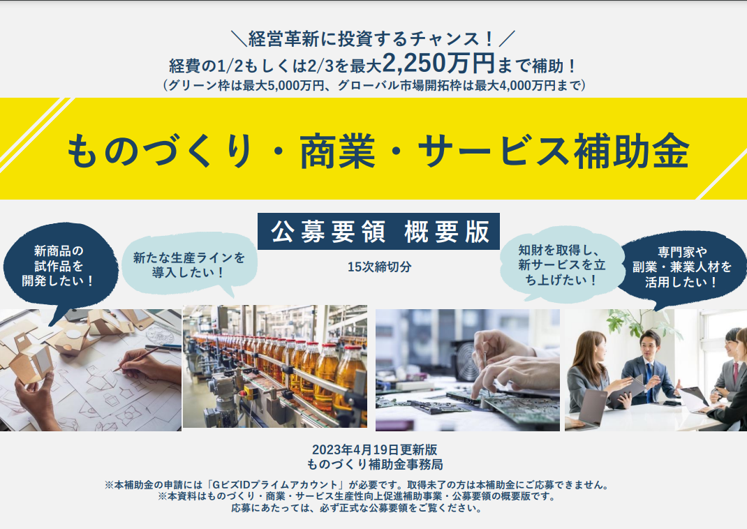 従業員数に応じて最大2,250万円、補助率2/3が受給できる、中小企業向けの補助金の中では大型の補助金となっています。(グリーン枠は最大5,000万円、グローバル展開型は最大4,000万円)