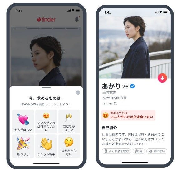 「今、求めるものは...」の機能は、「恋人がほしい」「いい人がいれば付き合いたい」「友達がほしい」「暇つぶし」「チャット相手」「まだわからない」の計6つの選択肢から、自分が“マッチングアプリを利用する目的”を選択し、プロフィールに表示することができます。出会いが多様化した現在では、プロフィールをきっかけに出会い、仲が深まったタイミングで初めて“お互いの求めている関係性が違った”ことを知るというケースもあります。Tinderは、ユーザーが「今、求めるものは...」を活用することで、自分の目的を示すだけでなく、相手の目的も理解できるようになり、より良いマッチを生み出すきっかけになると考えています。