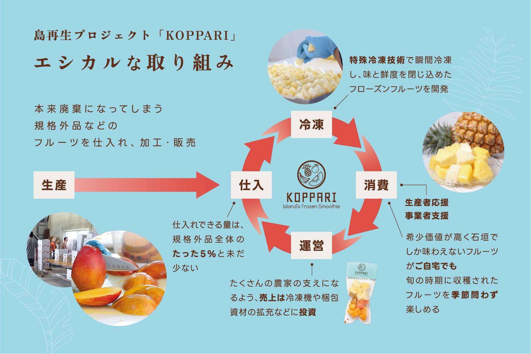 「コッパリ」とは島の言葉で「凍らせる」の意味。新型コロナウイルスの影響で、流通できない農産物を救うため、島 の基幹産業である農業の支えとなる事業をしたいという思いでスタートしました。本来廃棄になってしまう規格外 品などのフルーツを仕入れ、一番美味しい旬の時期に、特殊冷凍技術で瞬間冷凍。新鮮なフルーツの美味しさ をそのままに、保存料不使用のフローズンフルーツを開発・製造しています。季節を問わず、また普通であれば 現地でしか食べられない希少価値のあるフルーツを、場所を選ばずに楽しんでいただくことで消費を拡大し、生 産者や事業者を応援しています。