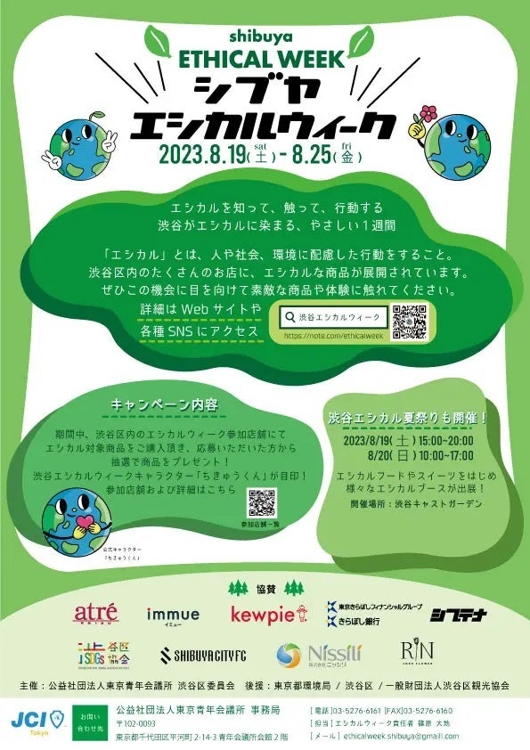 「渋谷エシカルウィーク」は、公益社団法人東京青年会議所渋谷区委員会が主催する、地域のエシカル消費を推進するキャンペーンです。2023年8月19日(土)から25日(金)までの7日間開催されます。「エシカル」とは、人や地域、社会、環境に配慮をした行動をすることです。ファッションやトレンドだけでなくエシカルについても最先端な渋谷を目指して開催されるこのキャンペーンに賛同し、協賛を決定しました。