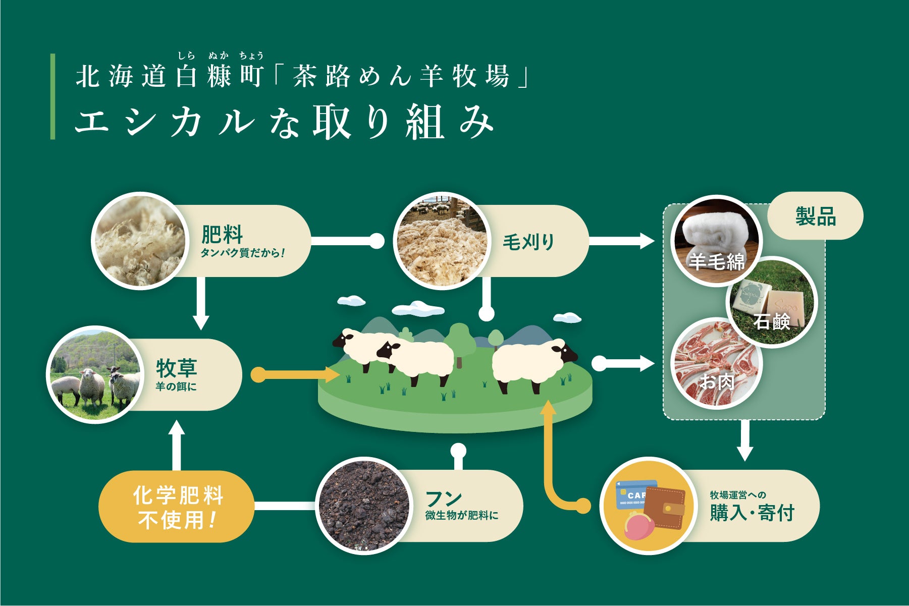 「茶路めん羊牧場」では、広々とした放牧地で、約900頭の羊が元気に飼育されています。 放牧を行い、主に草を餌として羊を育てています。羊のふん尿や、汚れや品質の問題で羊毛製品に使え なかった羊毛を堆肥にして放牧地に返す。そうすることで化学肥料を使わなくても大地が育ちます。羊が 放牧地の草を食べる。放牧地に堆肥を落とす。放牧地が育つ。またその草を羊が食べる…といったサステ ナブルな資源の循環を実現しています。