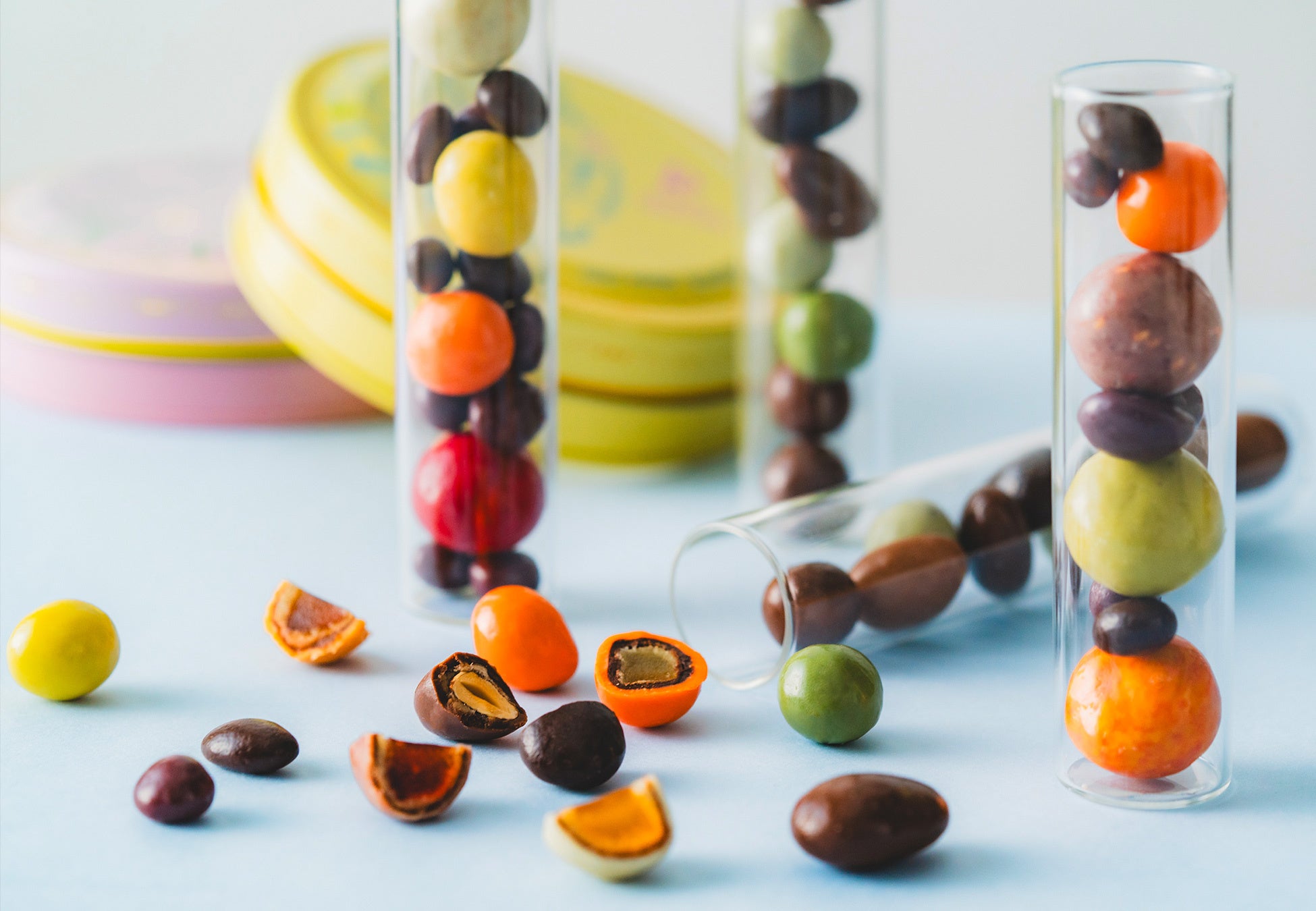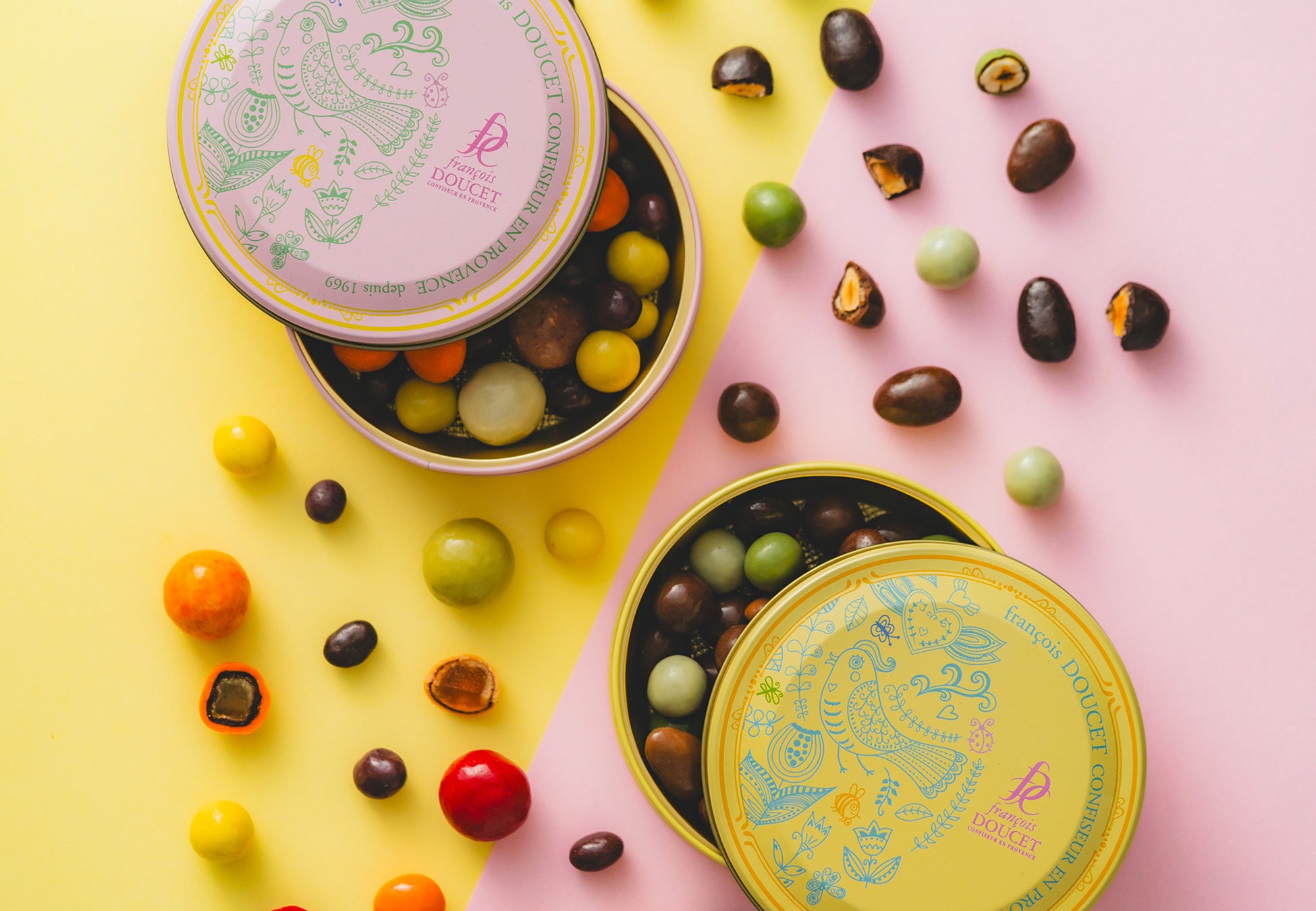 南フランスを代表するチョコレートの老舗ブランド「フランソワデュッセ」。子供の頃に食べたことがあるようなカラフルなチョコレートの中には、アーモンドやヘーゼルナッツ、フルーツのコンフィやフルーツピューレを用いたパートドフリュイが上品に包まれています。