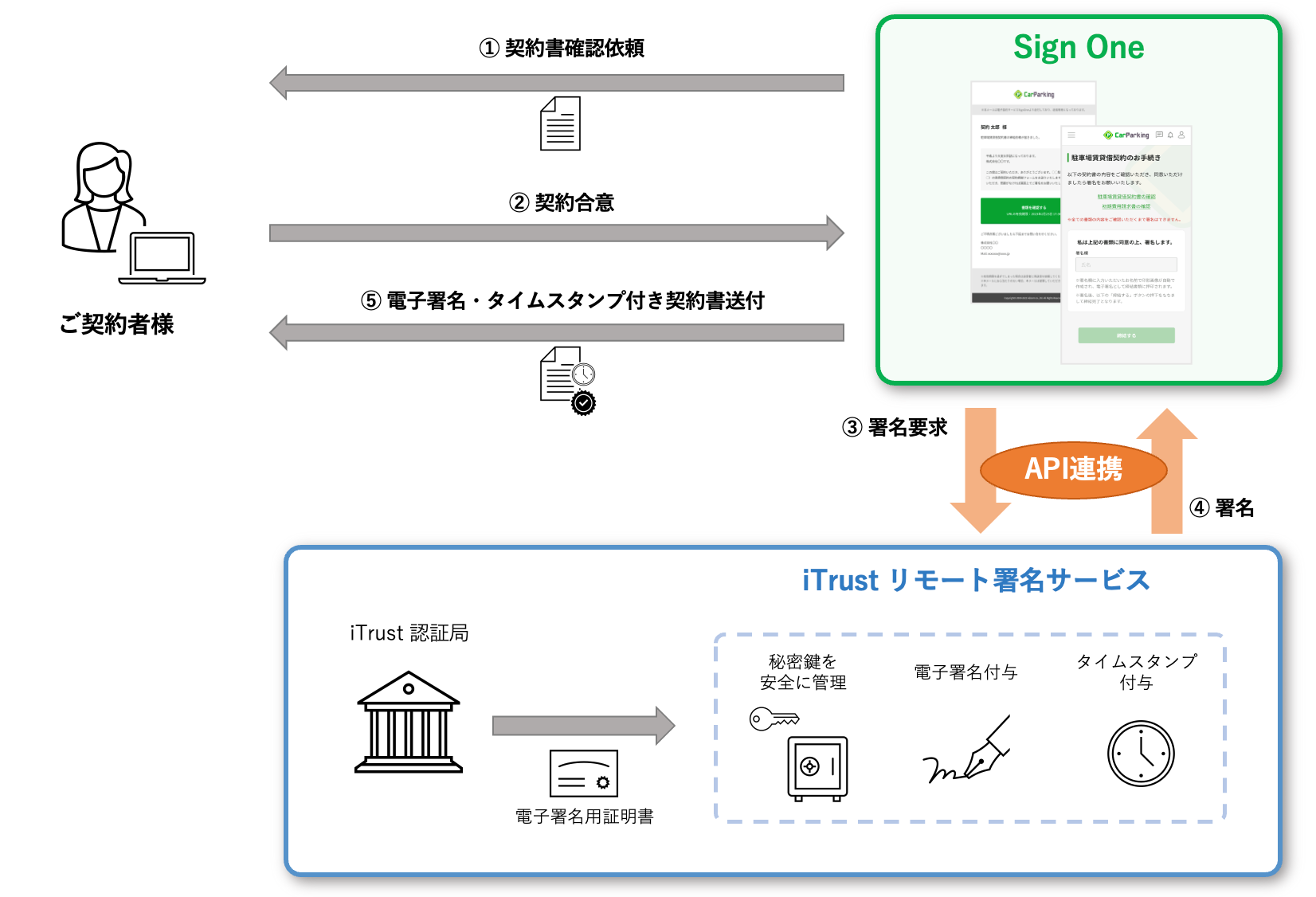 ※本サービスは、サイバートラスト株式会社が提供する「iTrust 電子署名用証明書」および「iTrust リモート署名サービス」とのAPI連携を通じ、契約書類の電子化を実現しています。