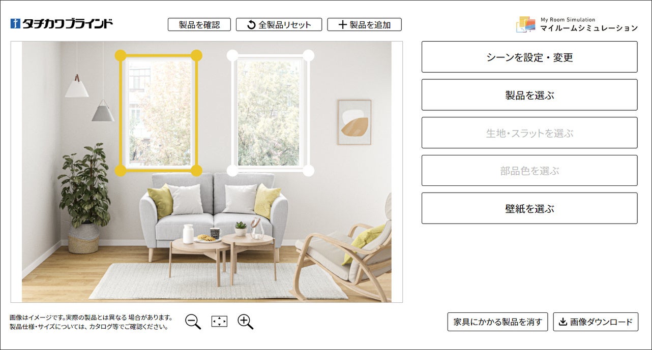 自分で撮影した空間画像にタチカワブラインド製品を取付けたイメージ画像が作れます。