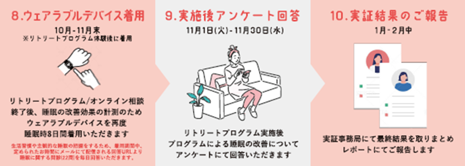 本実証事業では沖縄セルラーが提供するヘルスケアアプリ「JOTOホームドクター」を活用し、実証企業の女性従業員を対象に不眠症状や女性の健康課題に関する事前問診を実施し対象者を選定します。選定された対象者にACCELStarsの世界最高精度の睡眠測定技術を活用した睡眠測定用のウェアラブルデバイスを着用いただくことで、『睡眠』データを可視化します。その睡眠データと事前問診の内容を基に個別化されたリトリートプログラムをHerLifeLabが設計し、対象者にプログラムを提供することで「不眠症状」の改善を目指します。