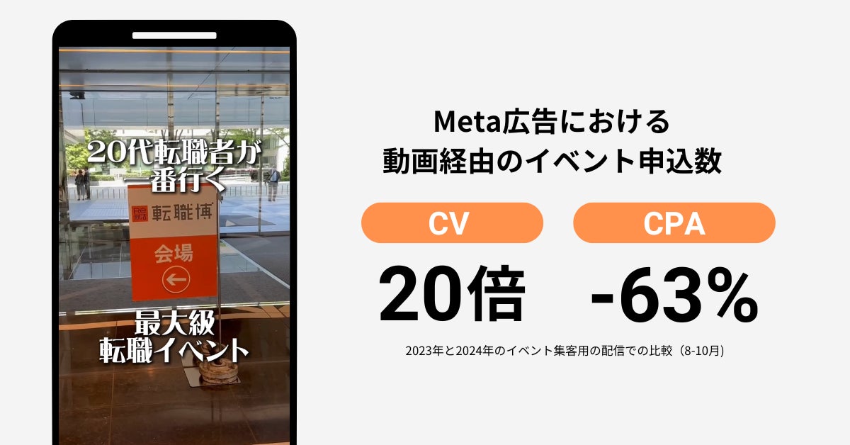 上記の方針で制作した動画を、各種SNSの広告配信に活用した結果、Meta広告のイベント集客における動画クリエイティブ経由のCPAが昨年比で約-60%低下、コンバージョン数が約20倍増加しました。Meta広告全体でのイベント集客のコンバージョンも昨年比で約3倍、そのうち15%以上を動画クリエイティブが占める形となり、動画が集客の主軸の一つとなりました。
