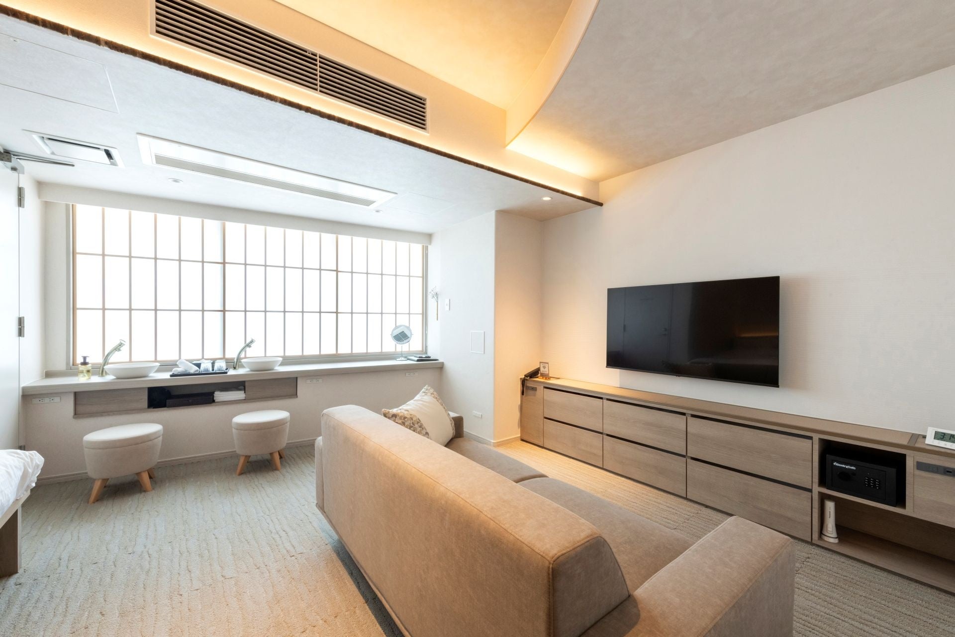 開放感とゆとりを叶える、都内でも稀少なメゾネットタイプの客室です。キッチンやダイニングテーブルのほか、冷蔵庫・洗濯機・乾燥機・電子レンジなど、中長期滞在にも便利な設備を完備。さらに、室内にはワークスペースを備え、仕事やリモートワークにも適した環境を整えました。上下のフロアを使い分けて、自分らしい時間を楽しめます。