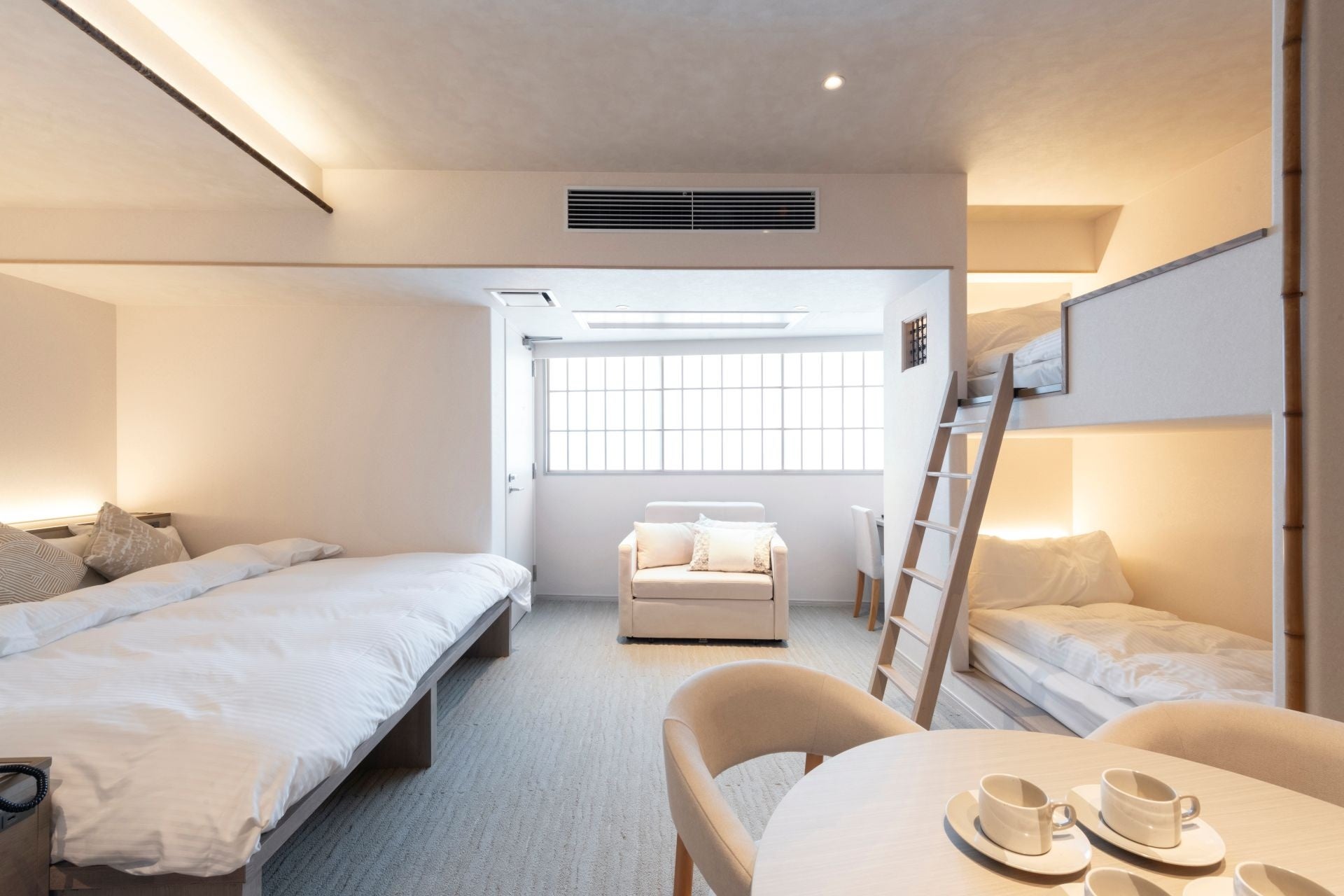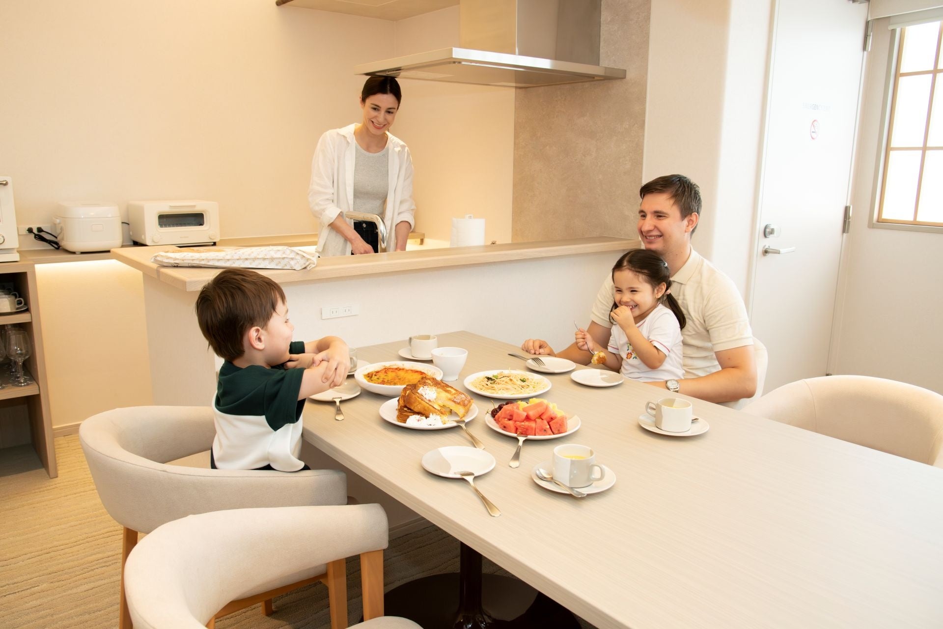 キッチンとダイニングテーブルのスペースを確保した客室です。冷蔵庫・洗濯機・乾燥機・電子レンジなど、中長期滞在にも便利な設備を揃えています。さらに、室内にはワークスペースも備え、仕事やリモートワークにも対応。みんな一緒のお部屋で、食事や会話を楽しみながら特別な時間を過ごせます。