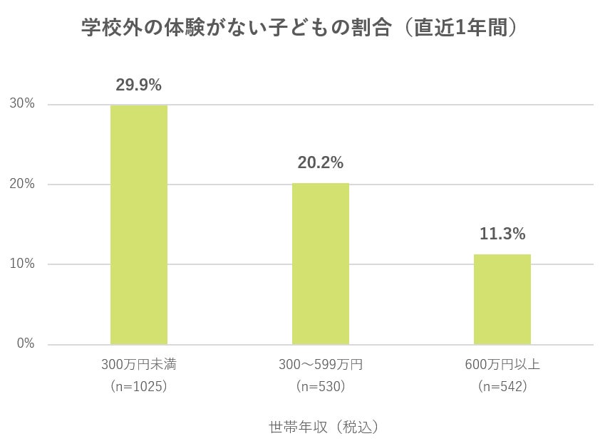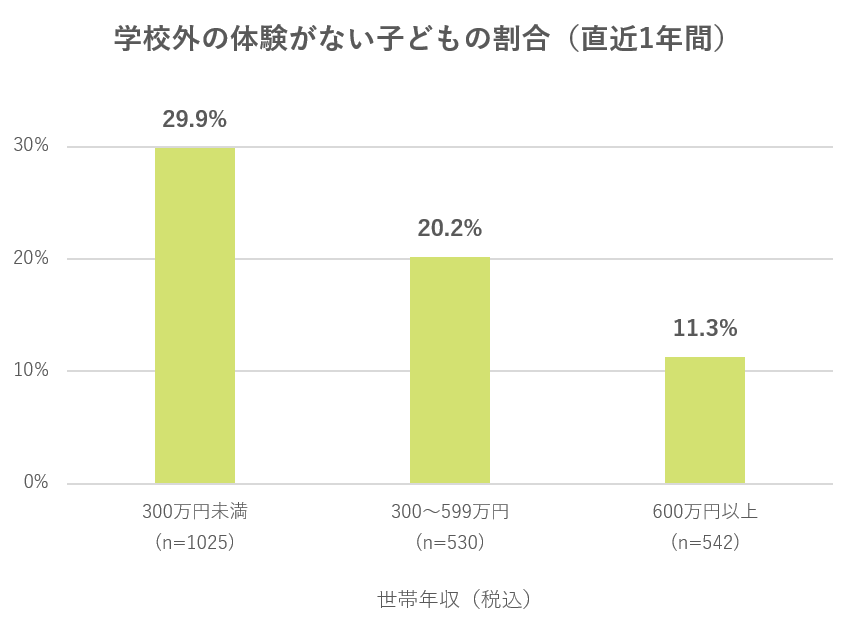 本調査の結果、世帯年収300万円未満の低所得世帯の子どものうち、約3人に1人(29.9%)が、1年を通じて学校外の体験活動を「何もしていない」ことがわかりました。学校外の体験活動を「何もしていない」子どもの割合は、世帯年収600万円以上の家庭(11.3%)と比較すると約3倍の差が生じています。
