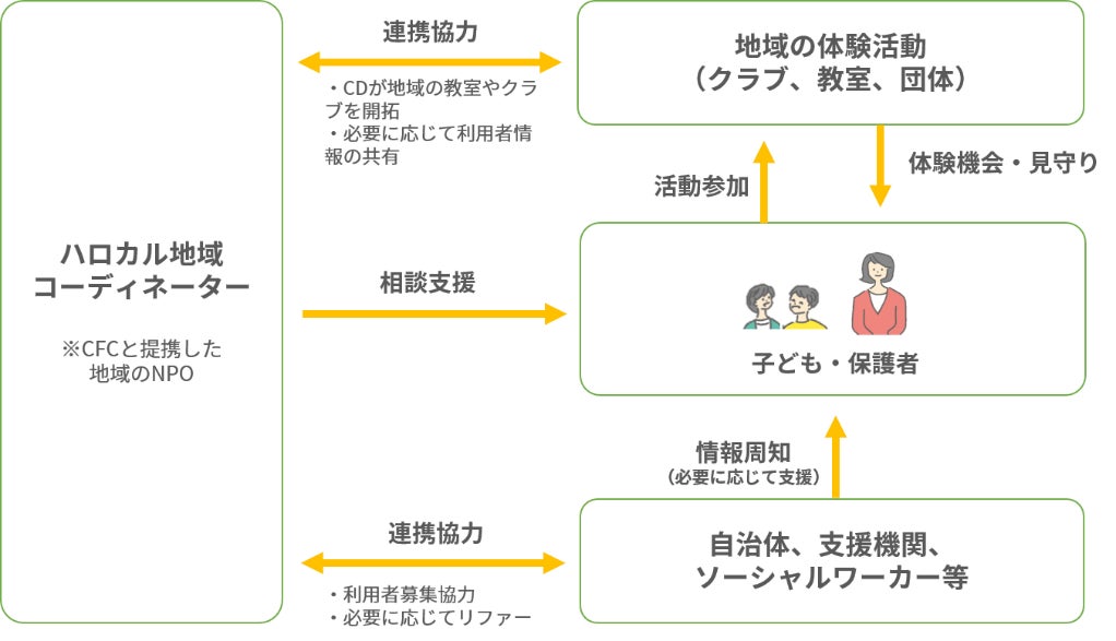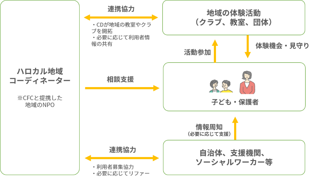 「地域コーディネーター」が、家庭の相談に応じるとともに、子どもたち一人ひとりの興味関心や特性等をふまえながら利用先の紹介を行い、子どもと地域の体験活動を繋げます。また、自治体やソーシャルワーカー等と連携し、支援にたどり着きにくい状況にある子どもや家庭に情報を届けたり、必要に応じて家庭と支援機関を繋げたりする役割を担います(地域コーディネーターは、CFCと提携した各地域のNPO等が担います)。