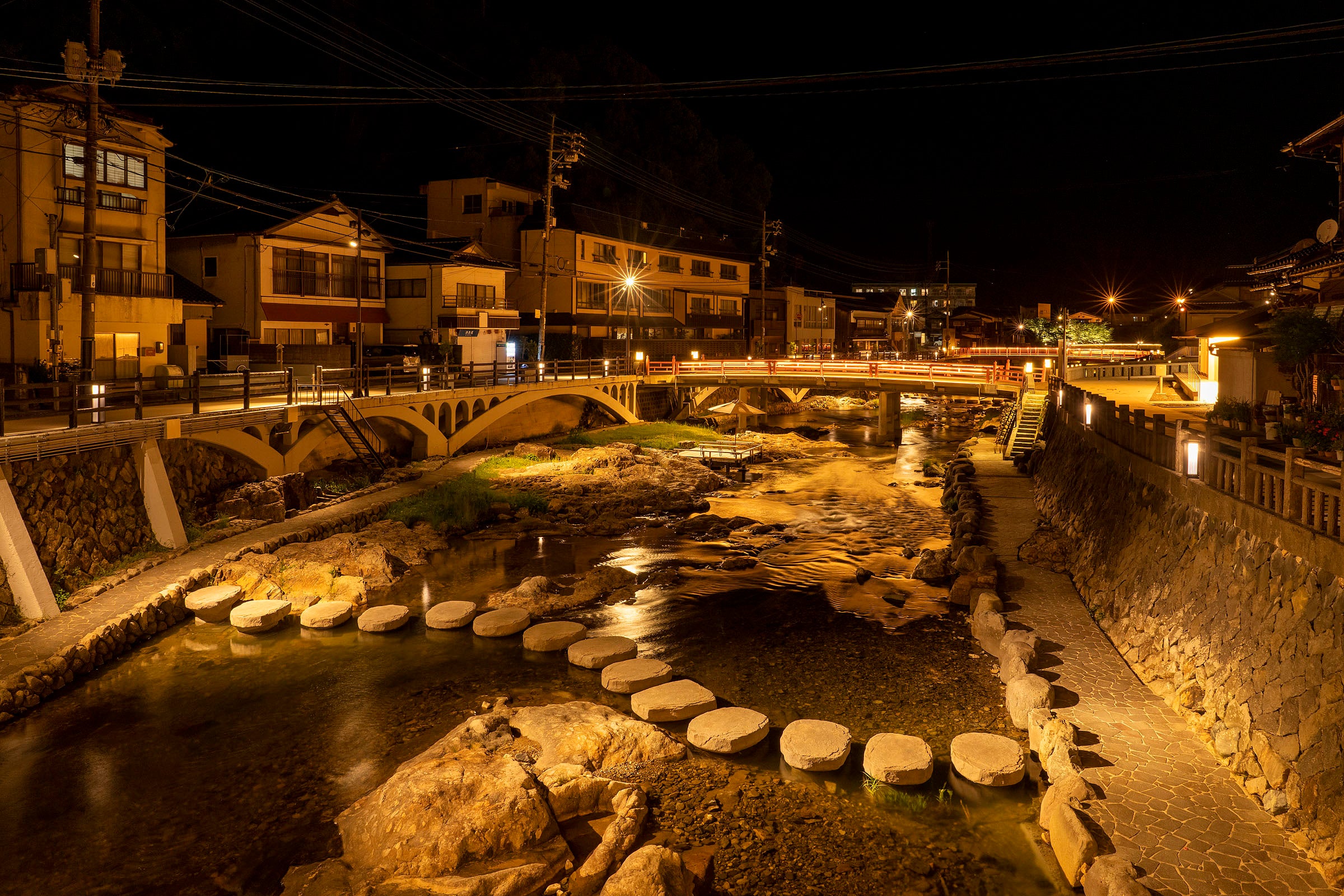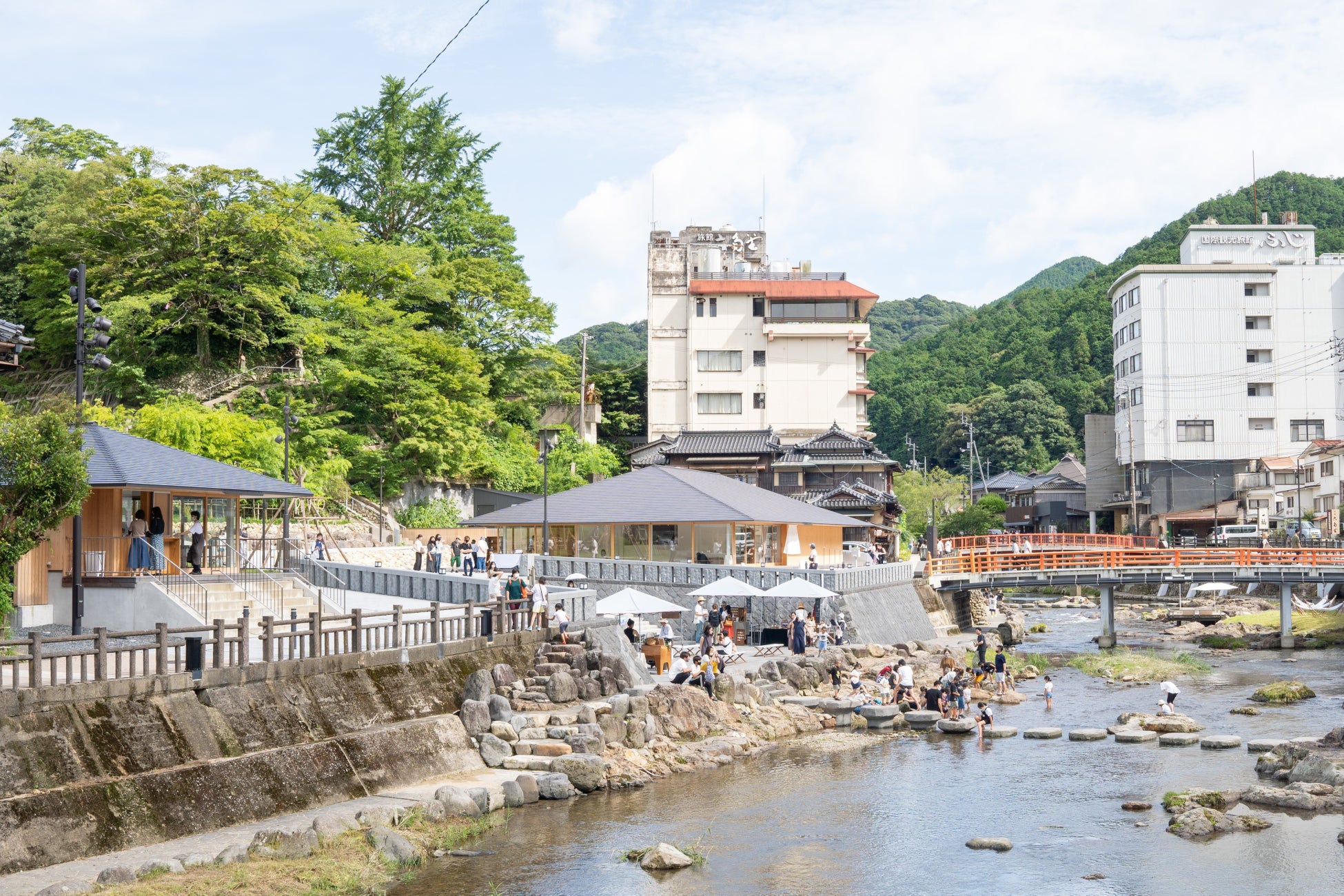 地域のシンボル恩湯や、山口県初となる川床テラスや飛び石、街中を照らす幻想的なライトアップ、レストランやカフェなども続々開業し、音信川沿いに広がるオソト天国です。