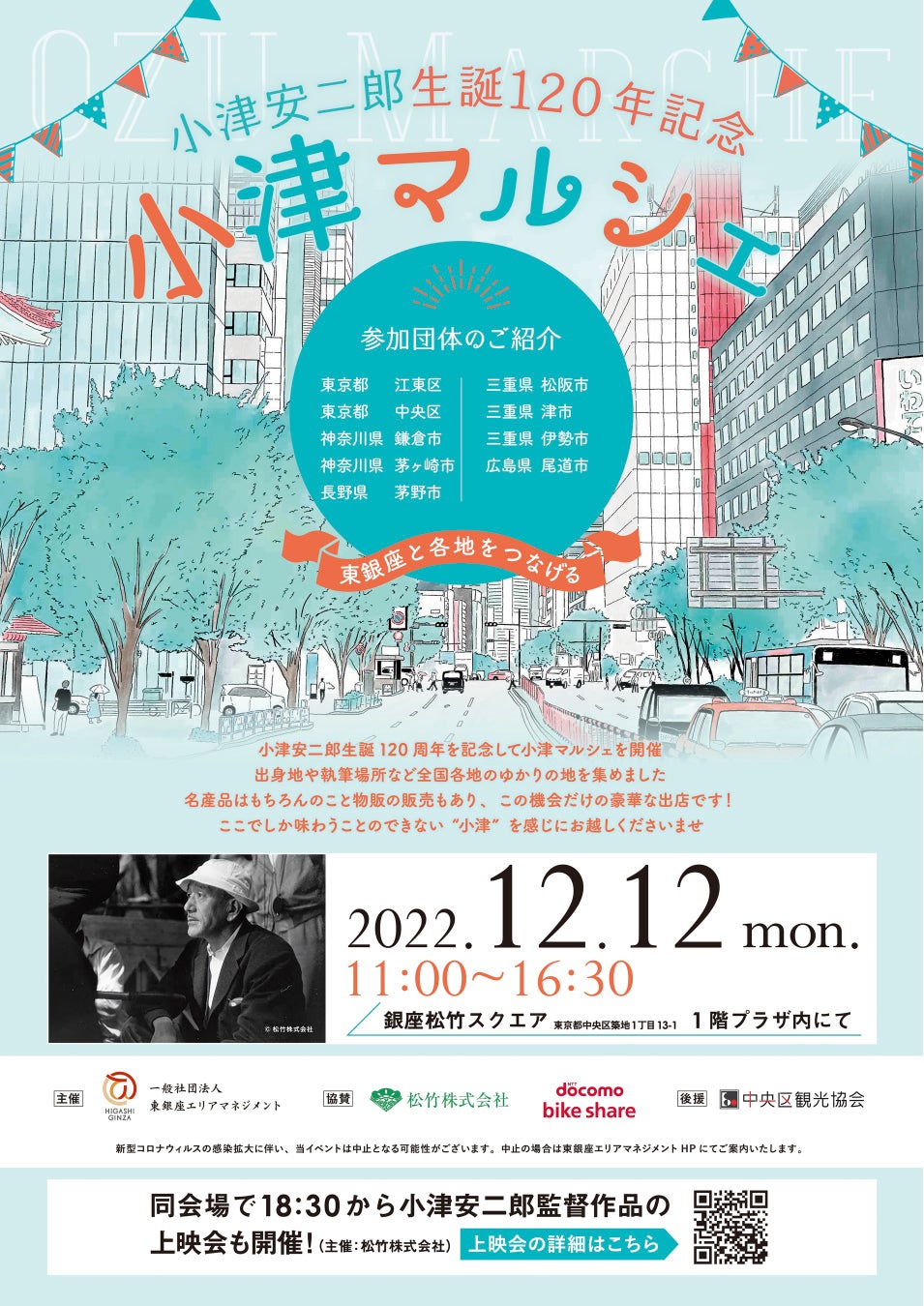 一般社団法人東銀座エリアマネジメントは、全国の自治体ご協力のもと「小津安二郎生誕120年記念 小津マルシェ」を開催します。