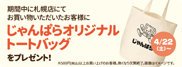 セール期間中に同店で500円(税込)以上お買い物いただいたお客様に先着で「じゃんぱらオリジナルトートバッグ」をプレゼント!なくなり次第終了となります。