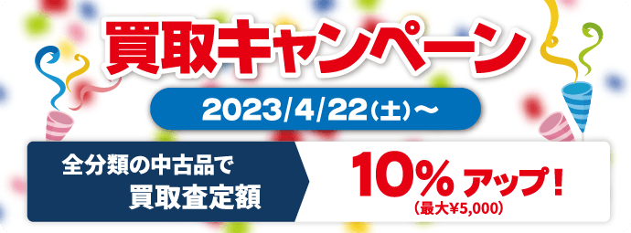 中古商品全品の買取査定額を10%(最大5,000円)アップするキャンペーンを実施いたします。