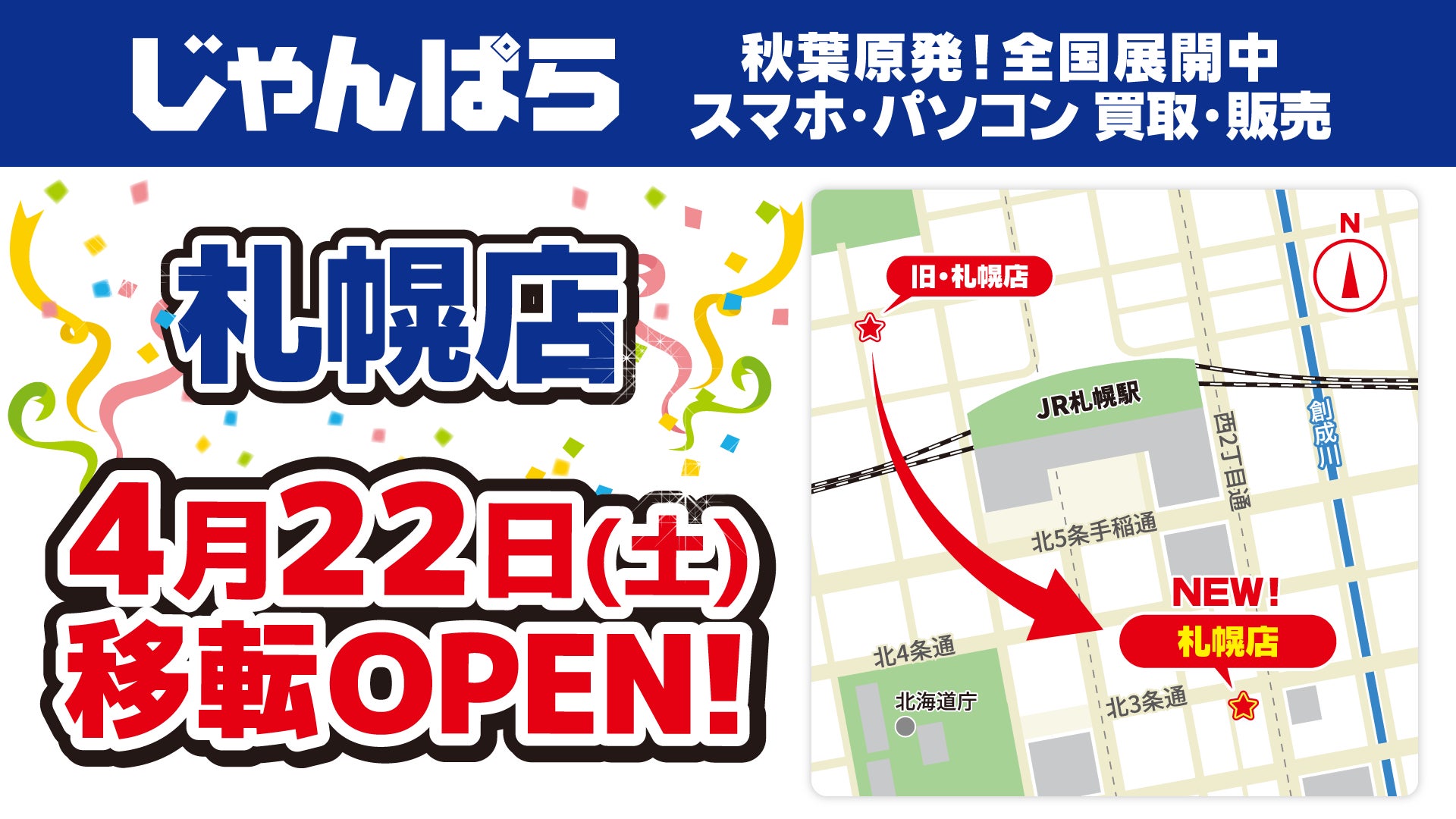 株式会社じゃんぱら(本社:東京都千代田区、代表取締役:小林 直純)が展開するスマホ・パソコンの買取・販売「じゃんぱら」は、「じゃんぱら札幌店」を移転し2023年4月22日(土)にリニューアルオープンいたします。