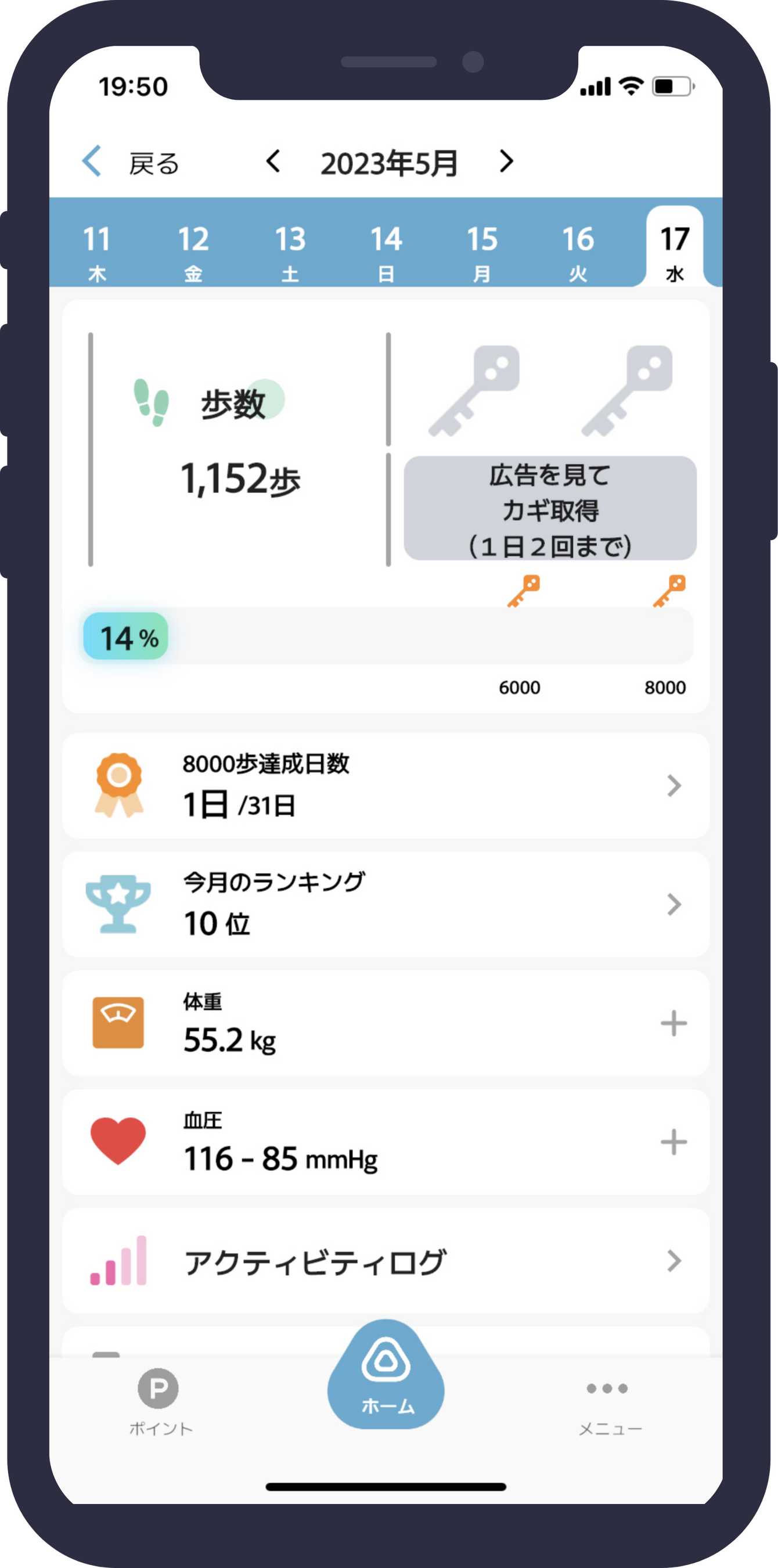 日々の歩数に応じて広告動画を閲覧し、宝箱チャレンジで使えるお宝のカギを獲得できます。動画は歩数が1日6,000歩および8,000歩を達成した際に見ることができるため、1日最大2回カギを獲得することができる仕様になっています。