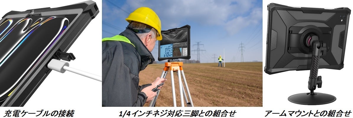 またThe Joy Factory製のアームマウント「MagConnect(マグコネクト)」シリーズ(別売)と組み合わせることで、さまざまな場所での使用に合わせて最適な配置が可能、屋内・屋外問わず、製造業、物流、ヘルスケア、小売など幅広いシーンでiPadを快適にご使用いただけます。