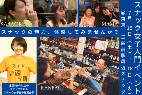 「スナック入門ツアー」の女性客需要の高まりを受け、より多くの女性にスナックの魅力を楽しんでいただける場として、7月15日(土)、18日(火)日本橋付近スナックにて女性客限定「スナック女子入門体験イベント」を初開催いたします。第一部では全国550件以上のスナックを巡り様々なメディアにも取り上げられているスナック女子 五十嵐真由子がスナックの楽しみ方や作法、お店選び、ママや常連さんとのコミュニケーションの取り方などを伝授するスナック講座(「スナック入門教科書」付)を開講。第二部では、実際のスナックにてママとのスナック体験タイムがスタート。スナック横丁に加盟し28年のキャリアを持つベテランママのおもてなしと、スナック初体験の女性限定ならではのスナックタイムを是非お楽しみください。