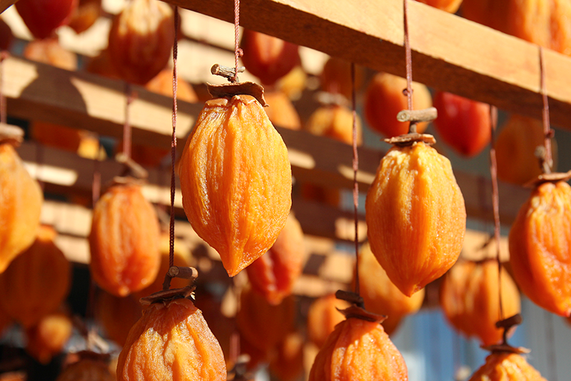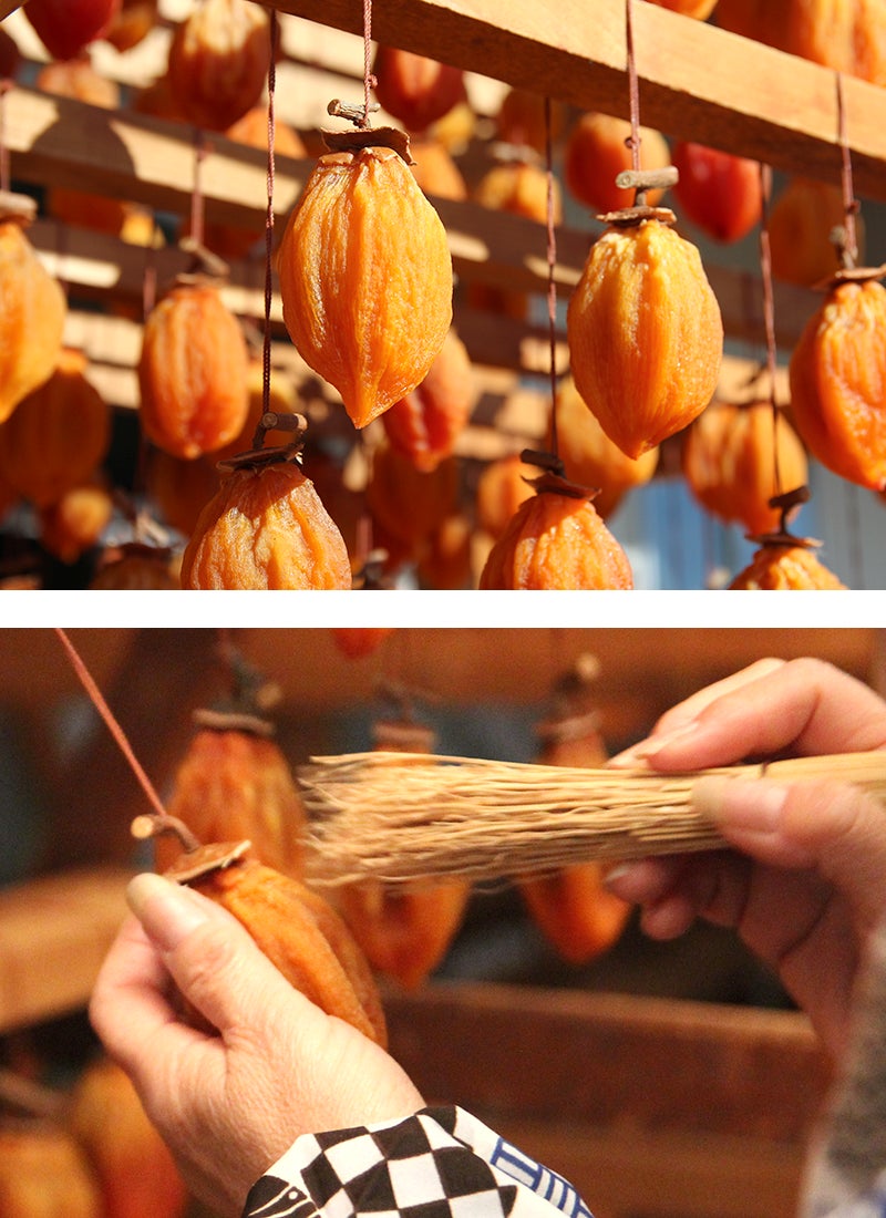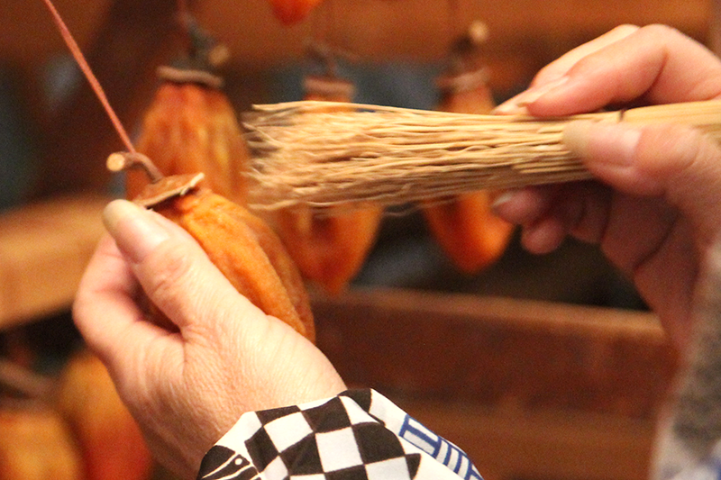 また乾燥工程で「手もみ」を行いながら、果実の外側と内側の水分を均一化し、稲わらで作ったほうき「ニオボウキ」で柿の表面をやさしく掃くことで、柿の甘みを引き出す技法は伝統技術として地域に根付いています。生産工程に手間がかかり、大量生産できない貴重な干し柿は、美濃加茂市出身の偉人「坪内逍遥」もこよなく愛したと言われています。